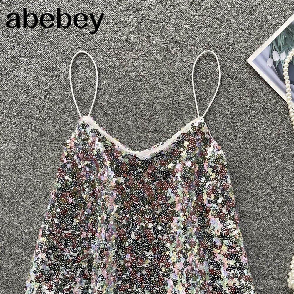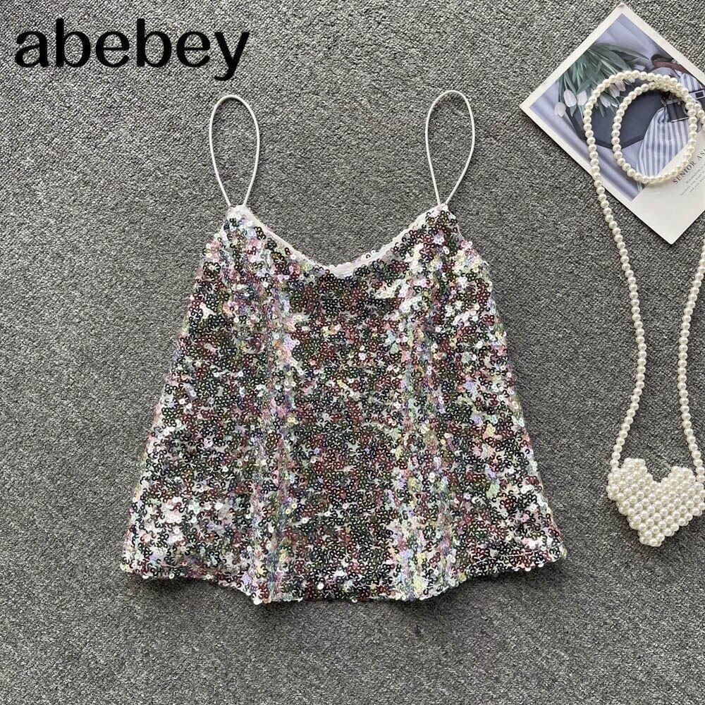 シャイニースパンコールストラップトップス女性セクシーノースリーブVネックパーティーY2Kトップスサマーオフショルダーショートキャミソール 夏物 Abe95625360895