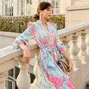 ヴィンテージフラワープリントロングドレスレディースウエストヒップサッシルーズベスティドスVカラーランタンスリーブパールボタンローブスプリング 春物 真珠 フラワーデザイン ビンテージ Rhc87710285355