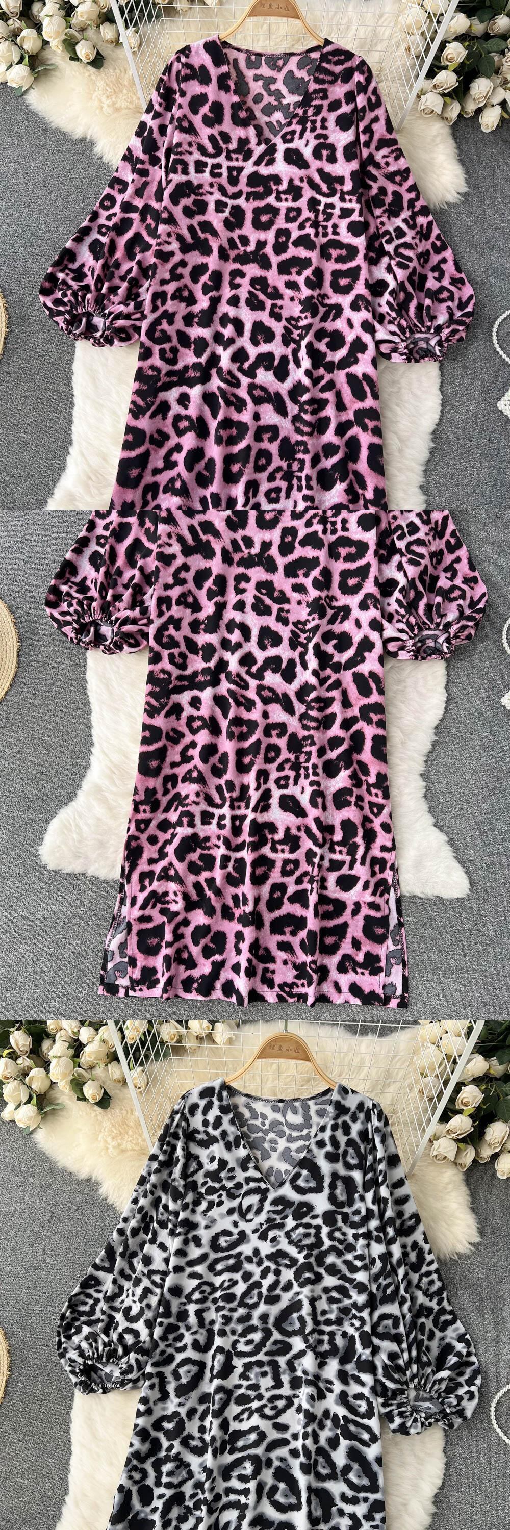 ヴィンテージレオパードプリントドレス女性長袖Vネックオーバーサイズルーズドレス春のセクシーなスプリットストリートウェアドレス ロング スプリング 春物 ビンテージ Abe49566298499