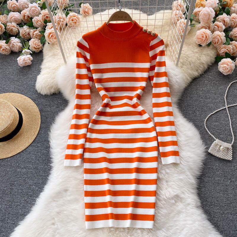 女性レトロストライプニットドレススタンドカラー長袖伸縮性スリム鉛筆ドレス秋のショートセータードレス ロング エラスティック オータム 秋物 Abe1321419025