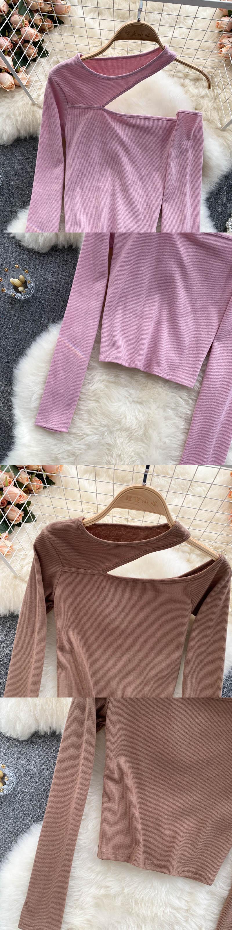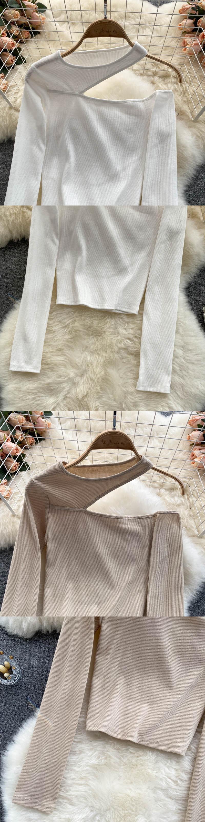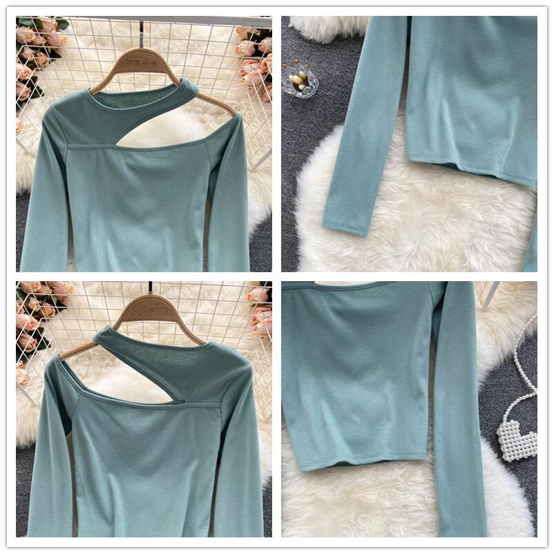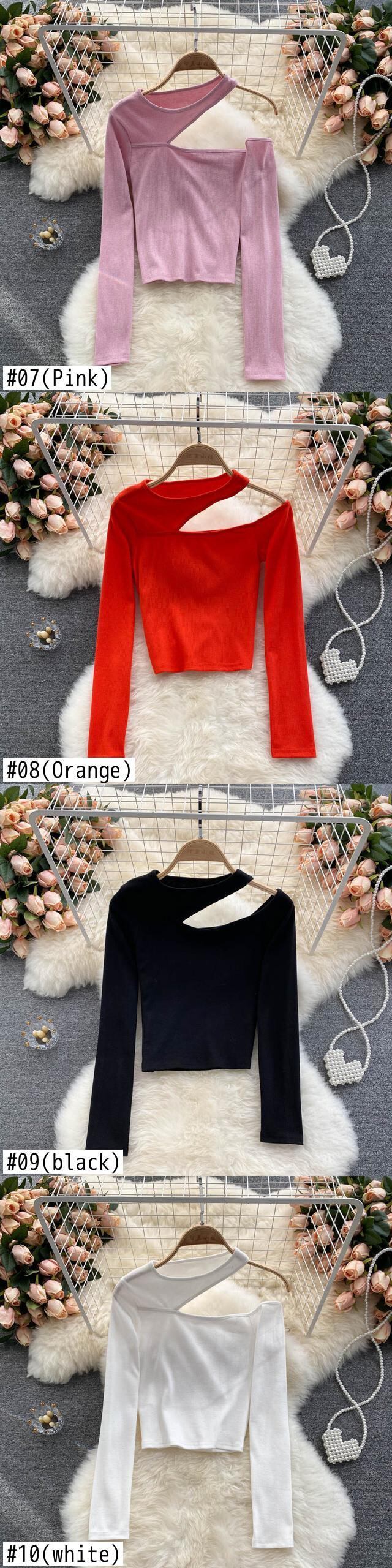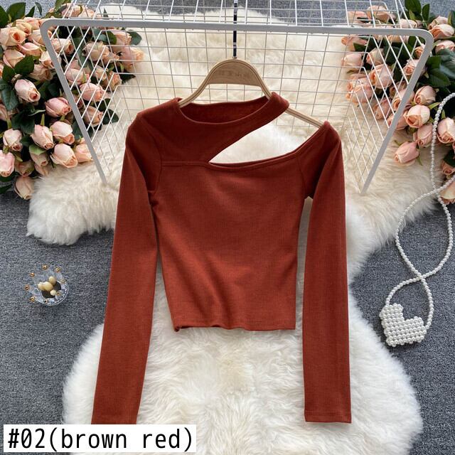中空オフショルダーブラウス女性長袖Oネックソリッドスリムトップ2022秋のストリートウェアショートブラウス ロング オータム 秋物 ソリッドカラー Abe46443444749