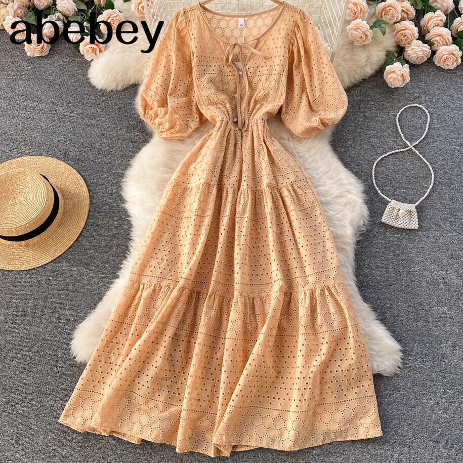 フランスの女性のドレススウィートパフスリーブVネックホローAラインドレスサマーソリッドバケーションミディサンドレス 大人ガーリー キュート カジュアル 夏物 ソリッドカラー Abe11462834290