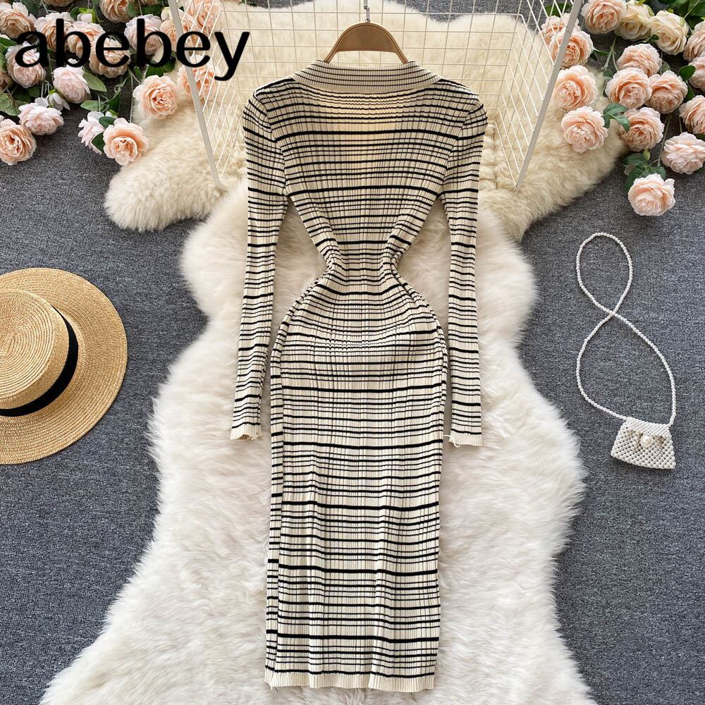 ヴィンテージストライプニットドレス女性シングルブレストターンダウン-襟スリムドレス秋冬ボディコンスプリットセータードレス オータム 秋物 ウィンター 冬物 ビンテージ Abe29553593293