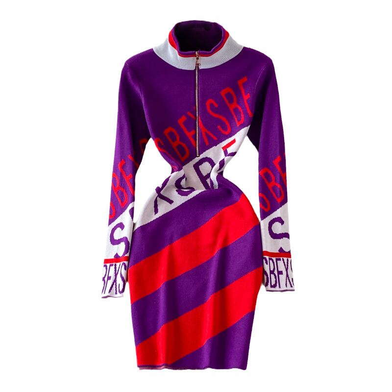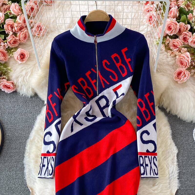 女性レタープリントニットドレスジッパースタンドカラー長袖スリムドレス秋冬セクシーボディコンセータードレス ロング オータム 秋物 ウィンター 冬物 Abe59762661829