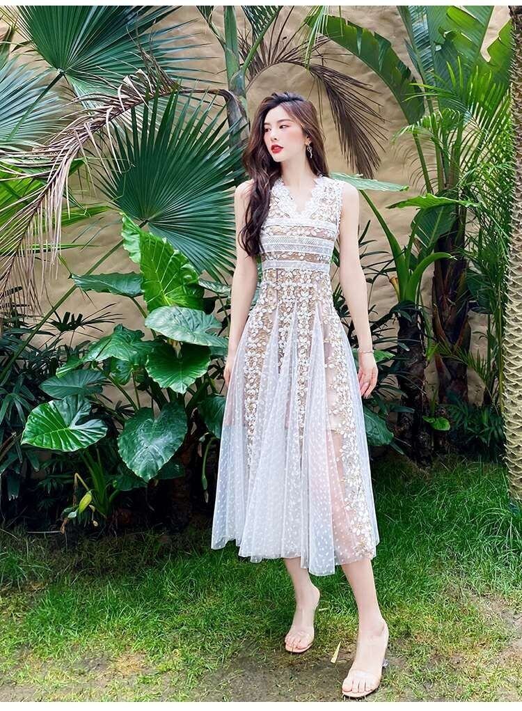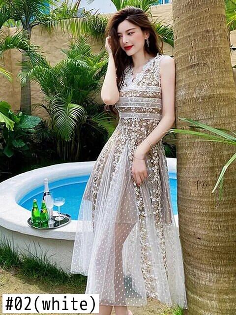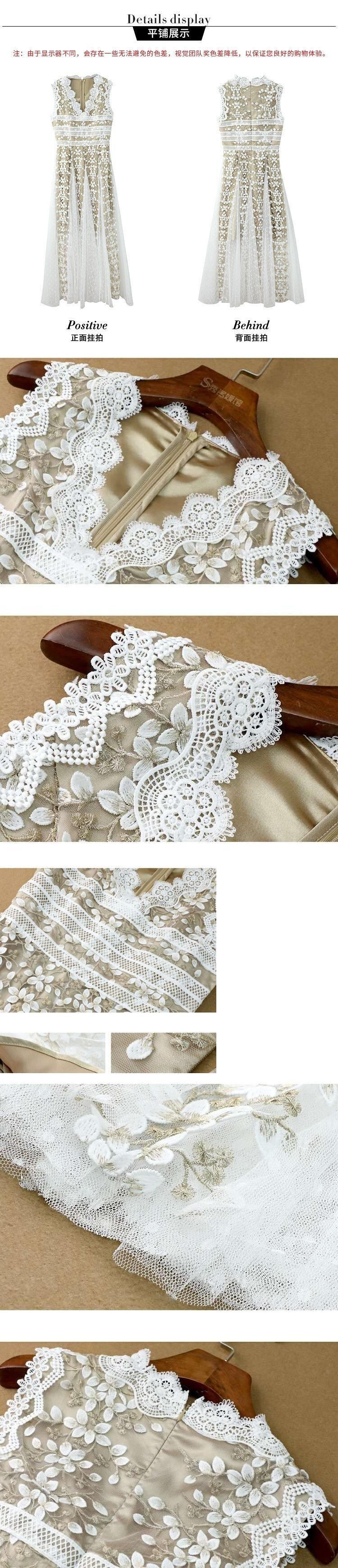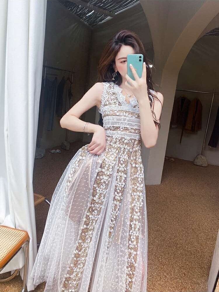 滑走路ヴィンテージホワイトブラックメッシュドレス2022夏の花刺繍Vネックノースリーブロングドレス女性 レッド サマー 夏物 フラワーデザイン ビンテージ Rhc49385302319