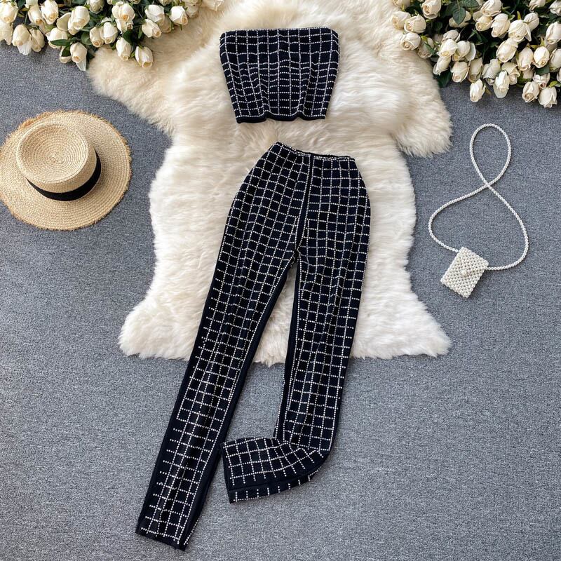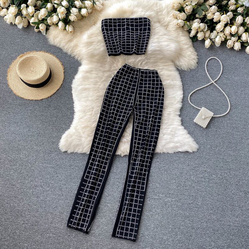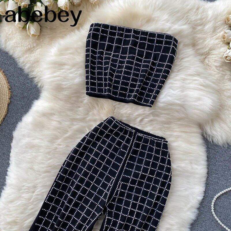 女性ストラップレスホットドリルセクシーな休暇パーティーウエストロングパンツツーピースセット秋冬 オータム 秋物 ウィンター 冬物 Abe90766739256