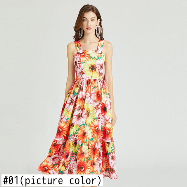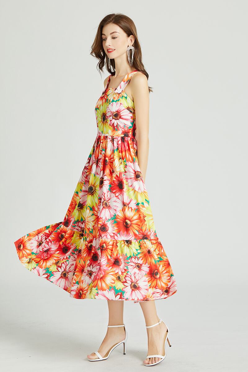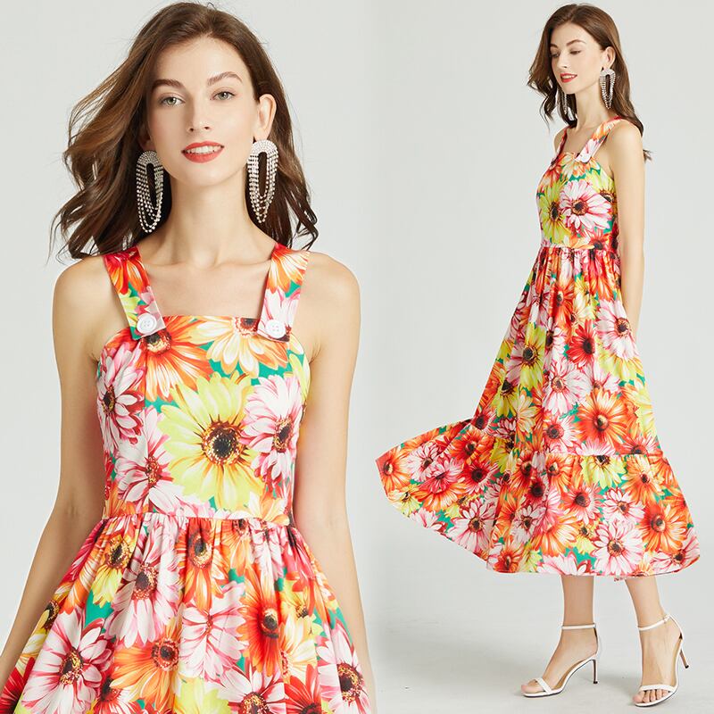 女性の夏のスパゲッティストラップドレス2021滑走路赤いひまわりプリントボタンロングパーティービーチドレス レッド サマー 夏物 フラワーデザイン Rhc51341192215