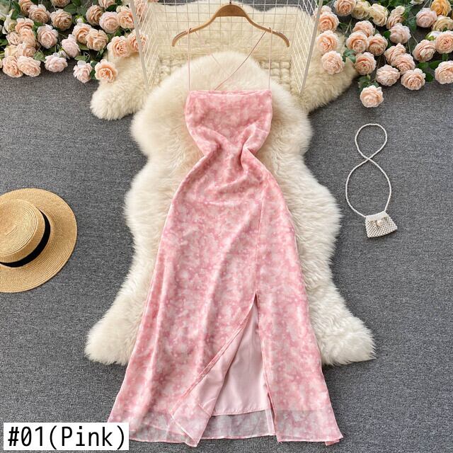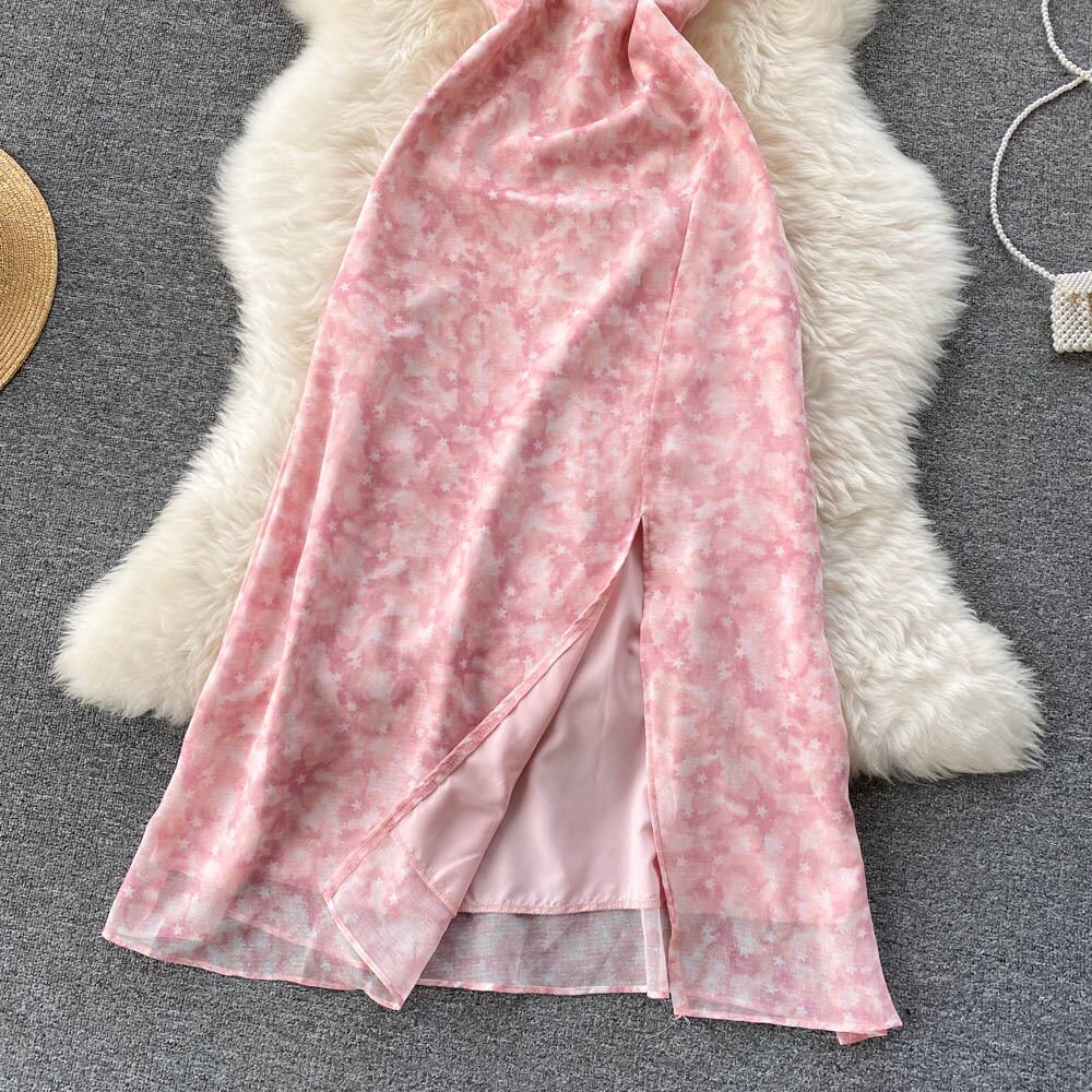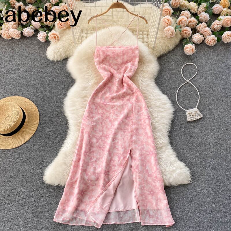 女性のセクシーな背中の開いたストラップドレスネクタイ染料プリントノースリーブAラインパーティードレスサマーシフォンスプリットビーチサンドレス 夏物 Abe23152691161