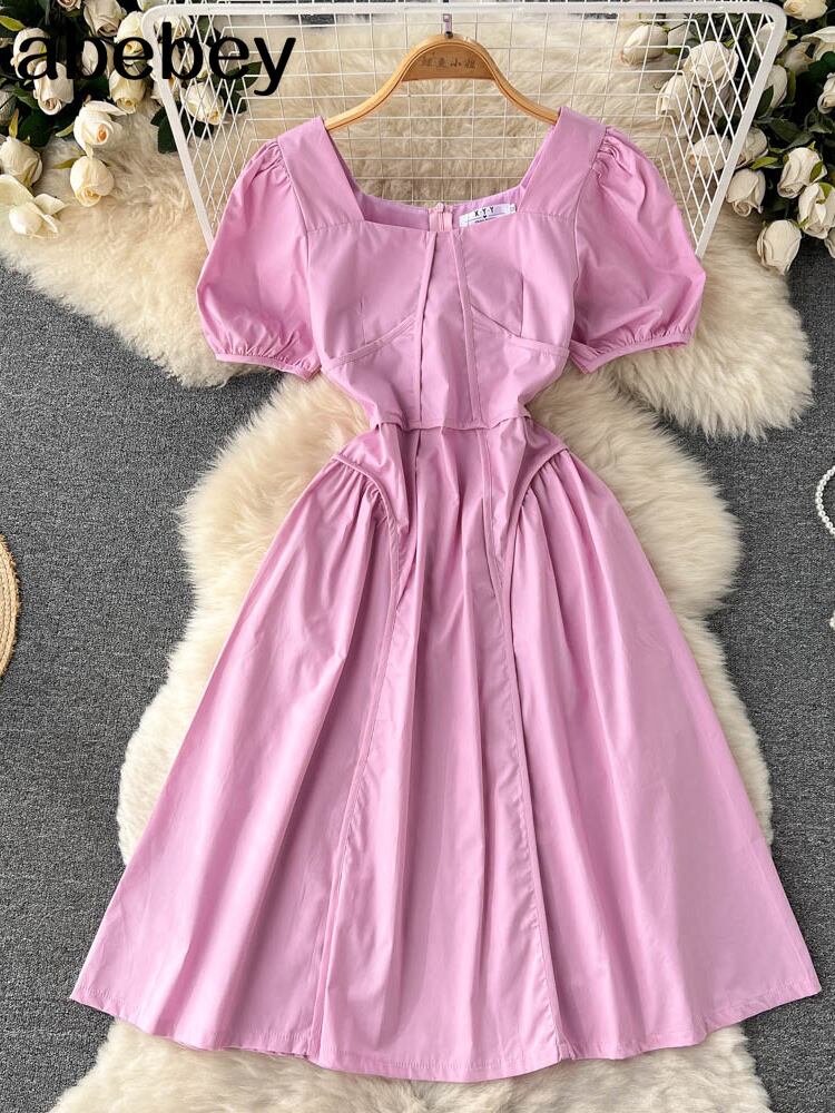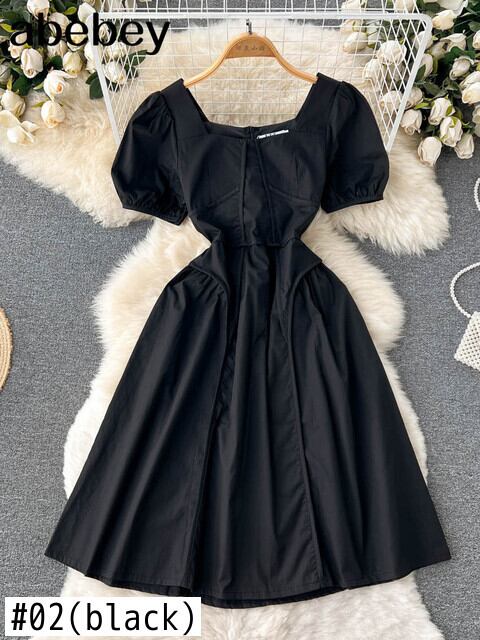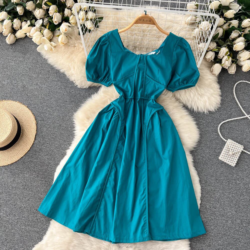 2022年春夏スクエアカラー無地半袖シックなドレスレディースフレンチウエスト気質女神ファンドレス ショート ハーフスリーブ スプリング 春物 サマー 夏物 ソリッドカラー スクウェア Abe29700275966