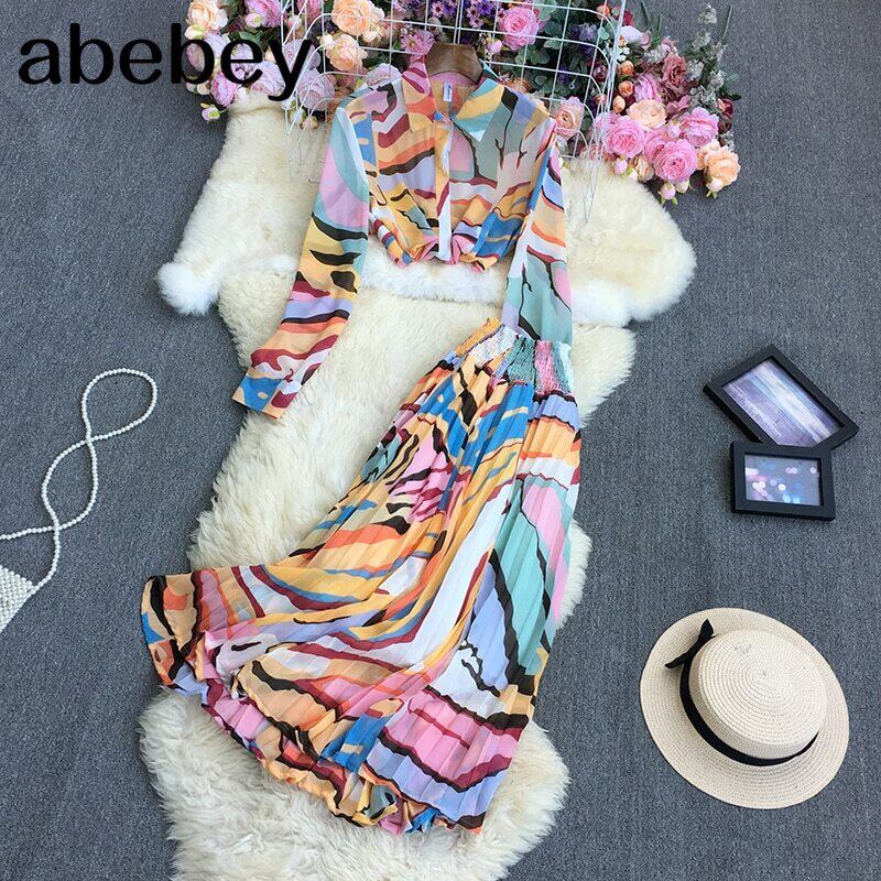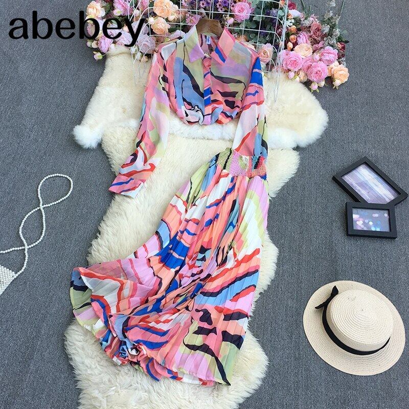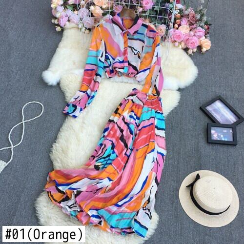 2022年春秋ターンダウンカラー長袖プリントシャツトップ+ハイウエストロングAラインプリーツスカートツーピースセット ハイウェスト スプリング 春物 オータム 秋物 Abe19593463367
