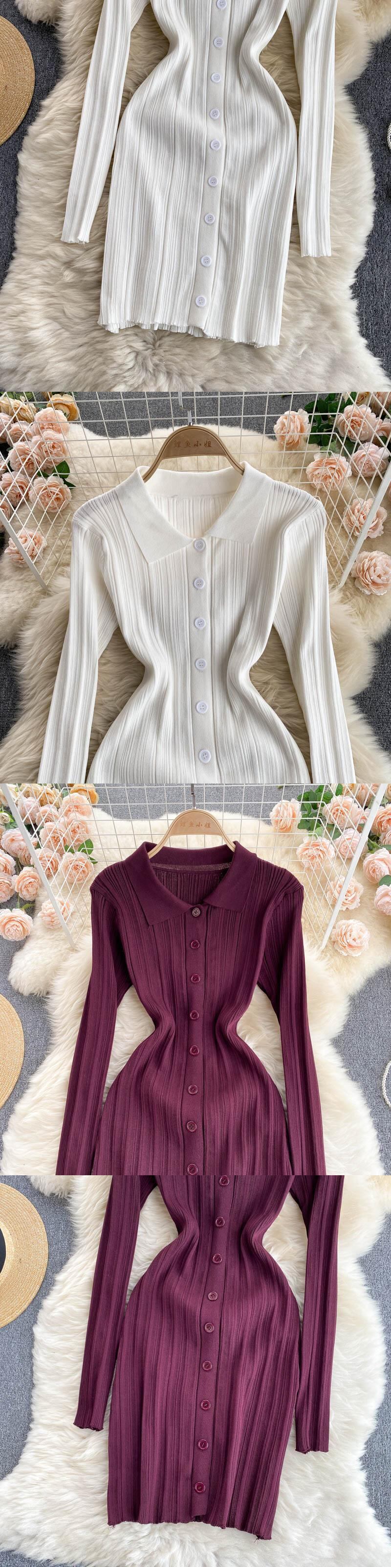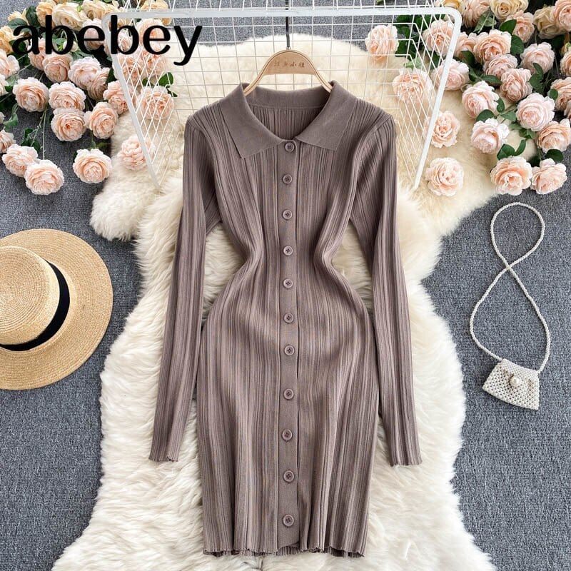 女性のセクシーなセータードレスターンダウン-襟長袖伸縮性鉛筆ドレス秋のボタンボディコンストライプニットドレス ロング エラスティック オータム 秋物 Abe78069222183