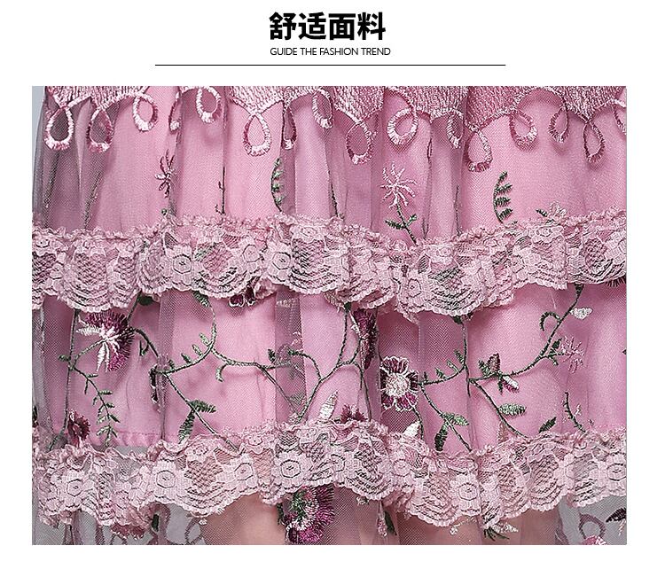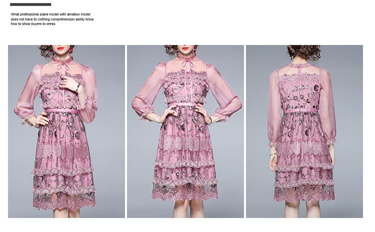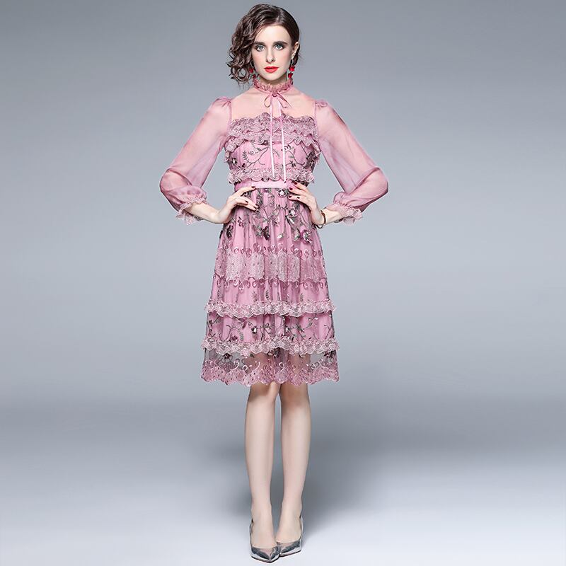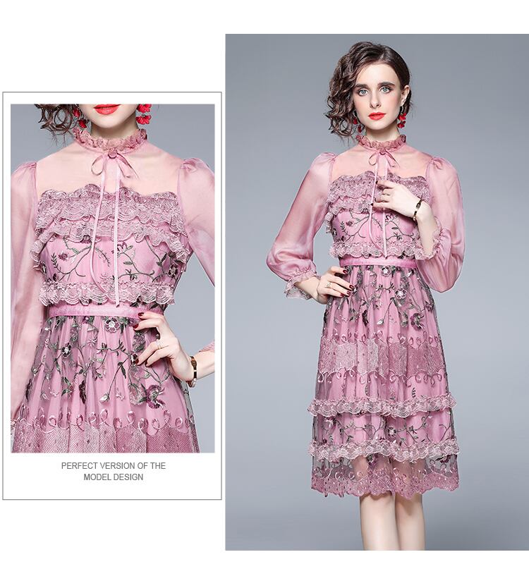 滑走路高級メッシュレース刺繍ドレス2022夏の女性ランタンスリーブフラワー刺繍オフィスパーティーニードレス レッド サマー 夏物 フラワーデザイン 会社 学校 通勤や通学にも Rhc98809432507