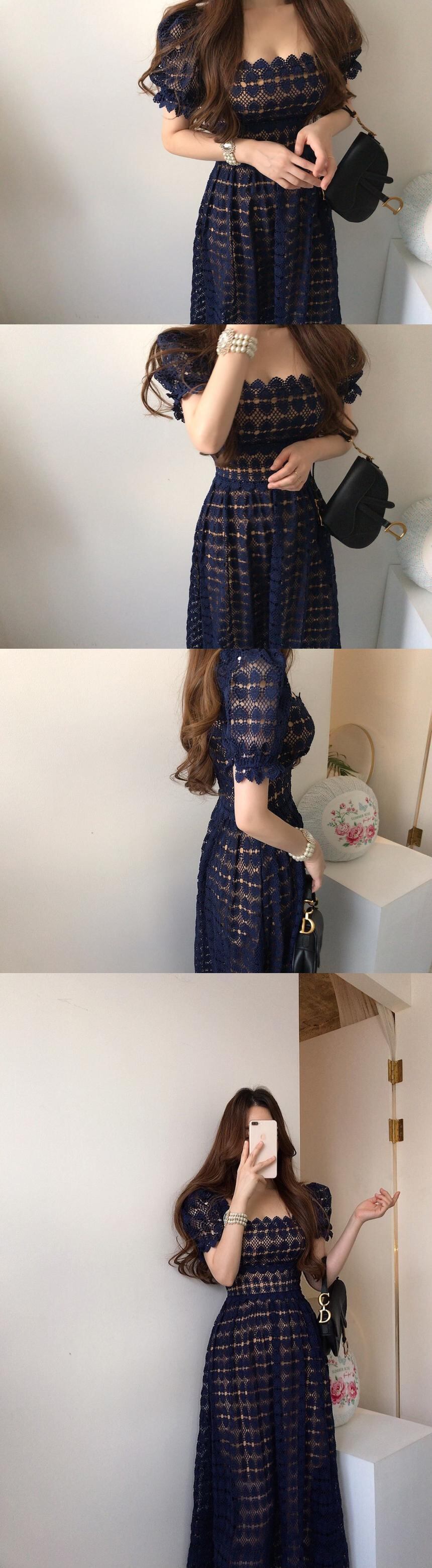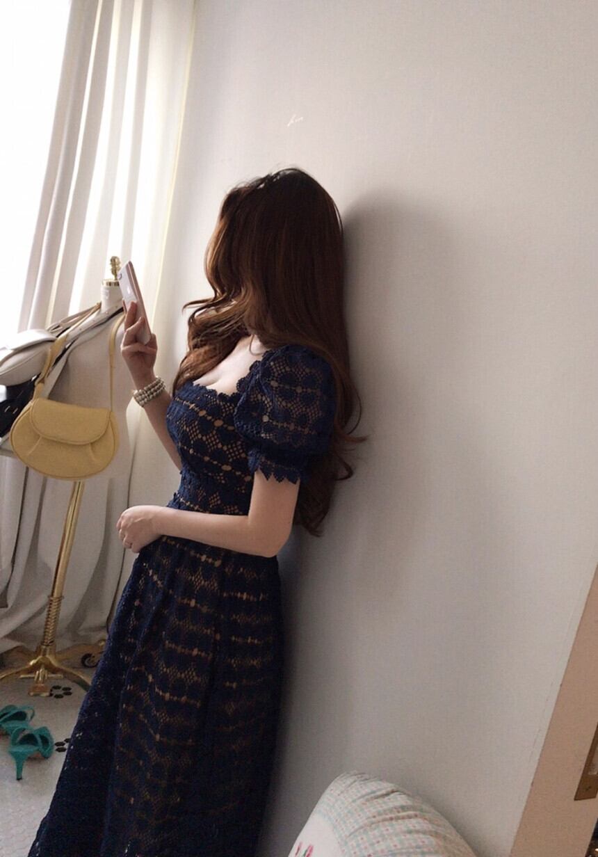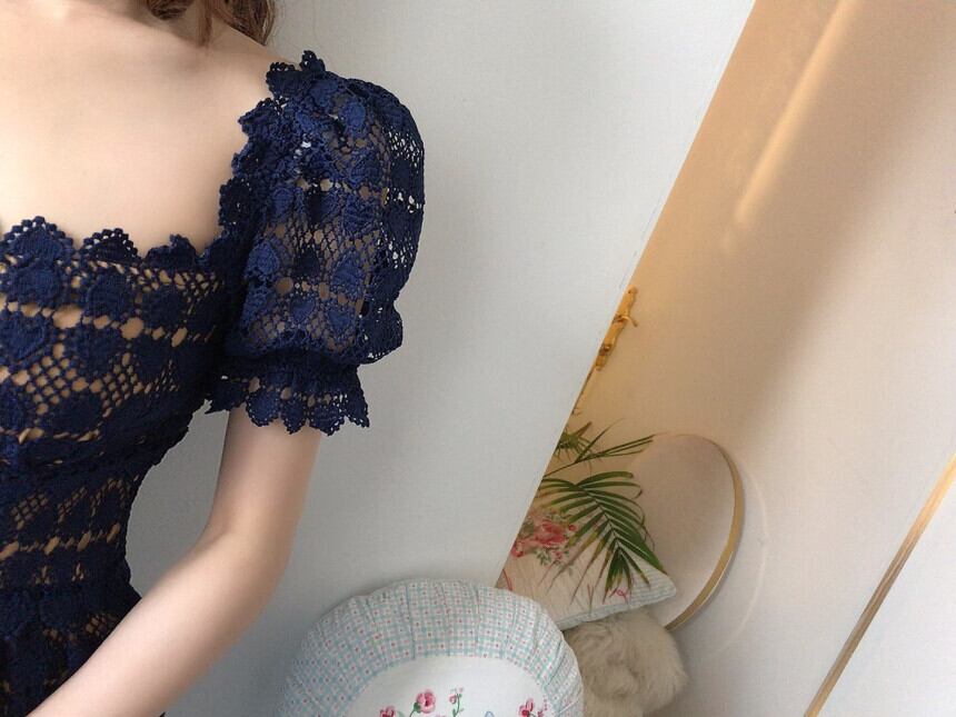 スクエアカラーの女性のレースのドレススウィートホローアウトスリムパフスリーブミディロングドレス2022春のウエストパーティードレス 大人ガーリー キュート カジュアル スプリング 春物 スクウェア Rhc9299846659