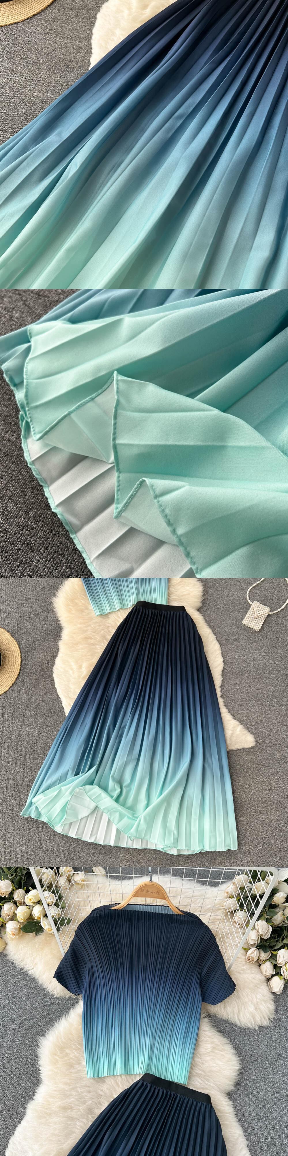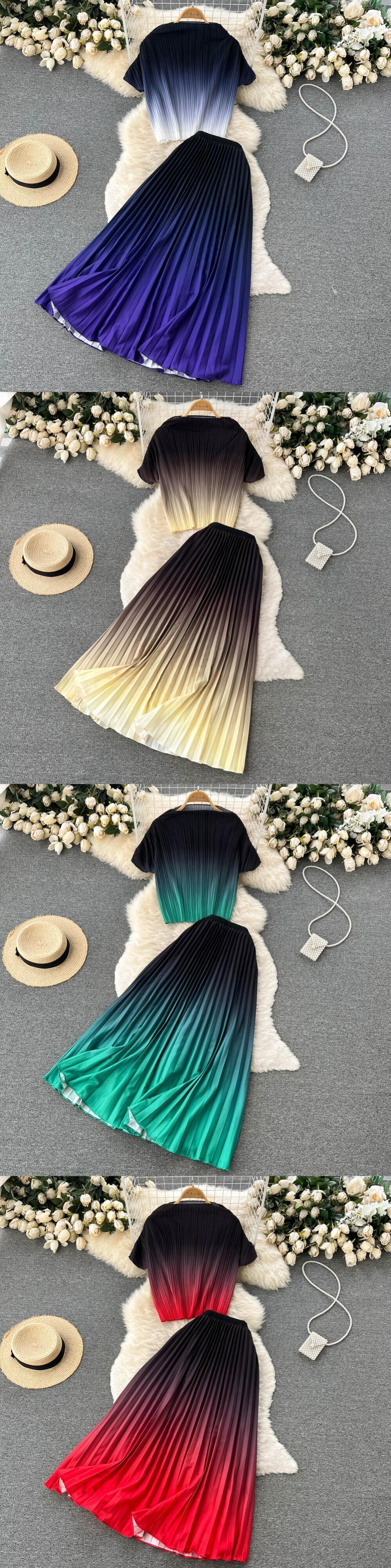 女性サマーグラジエント気質セット2022サマー半袖トップスラインロングスカートツーピースセット ショート ハーフスリーブ 夏物 Aライン Abe156246332