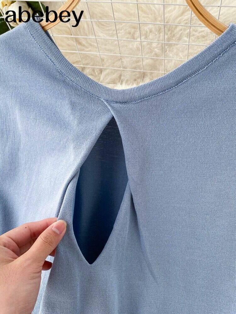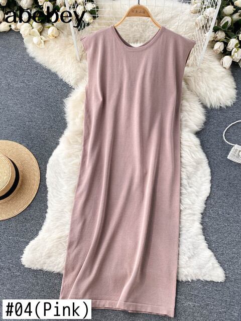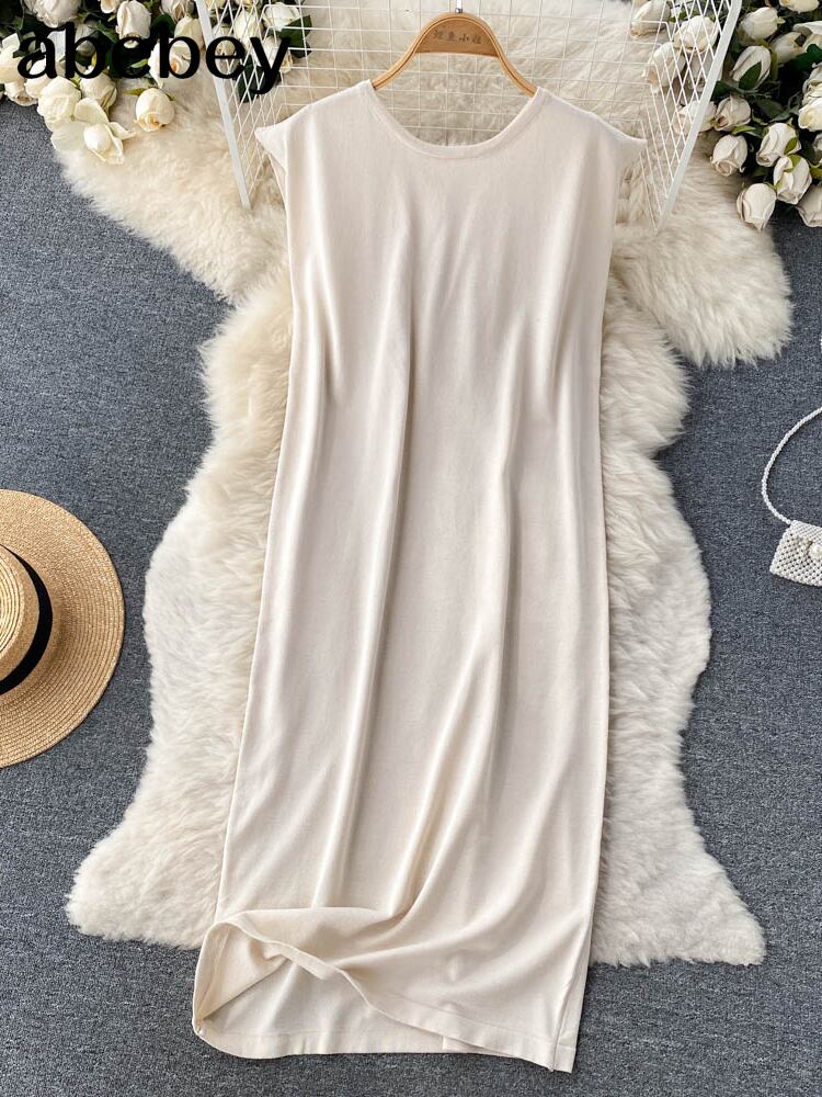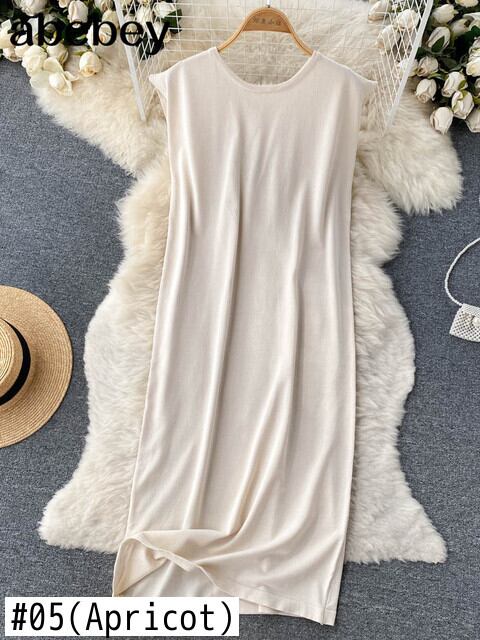 プルオーバーOネックニットドレス女性ノースリーブベストドレス2022サマーソリッドスプリットミディニットVestidos 夏物 ソリッドカラー Abe72805792596