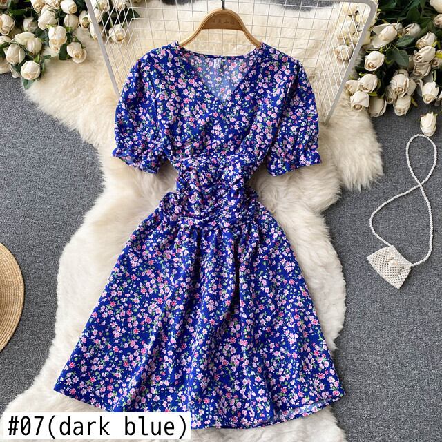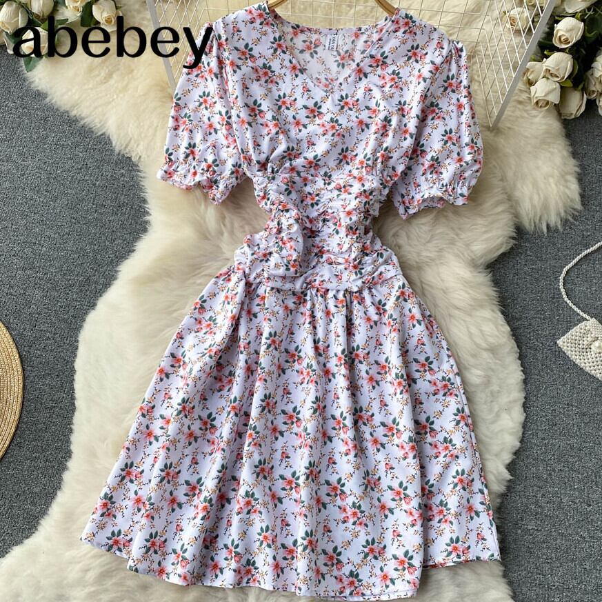 夏のシフォンフローラルドレス女性フレンチスウィートパフスリーブVネックAラインドレスボヘミアンプリントビーチサンドレス 大人ガーリー キュート カジュアル サマー 夏物 花柄 Abe61608023139