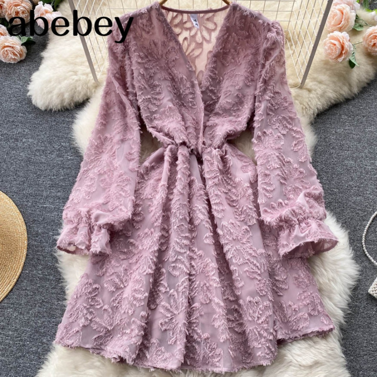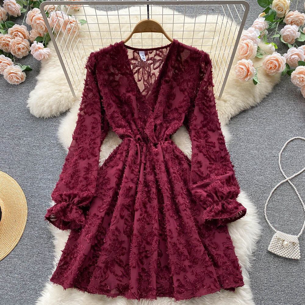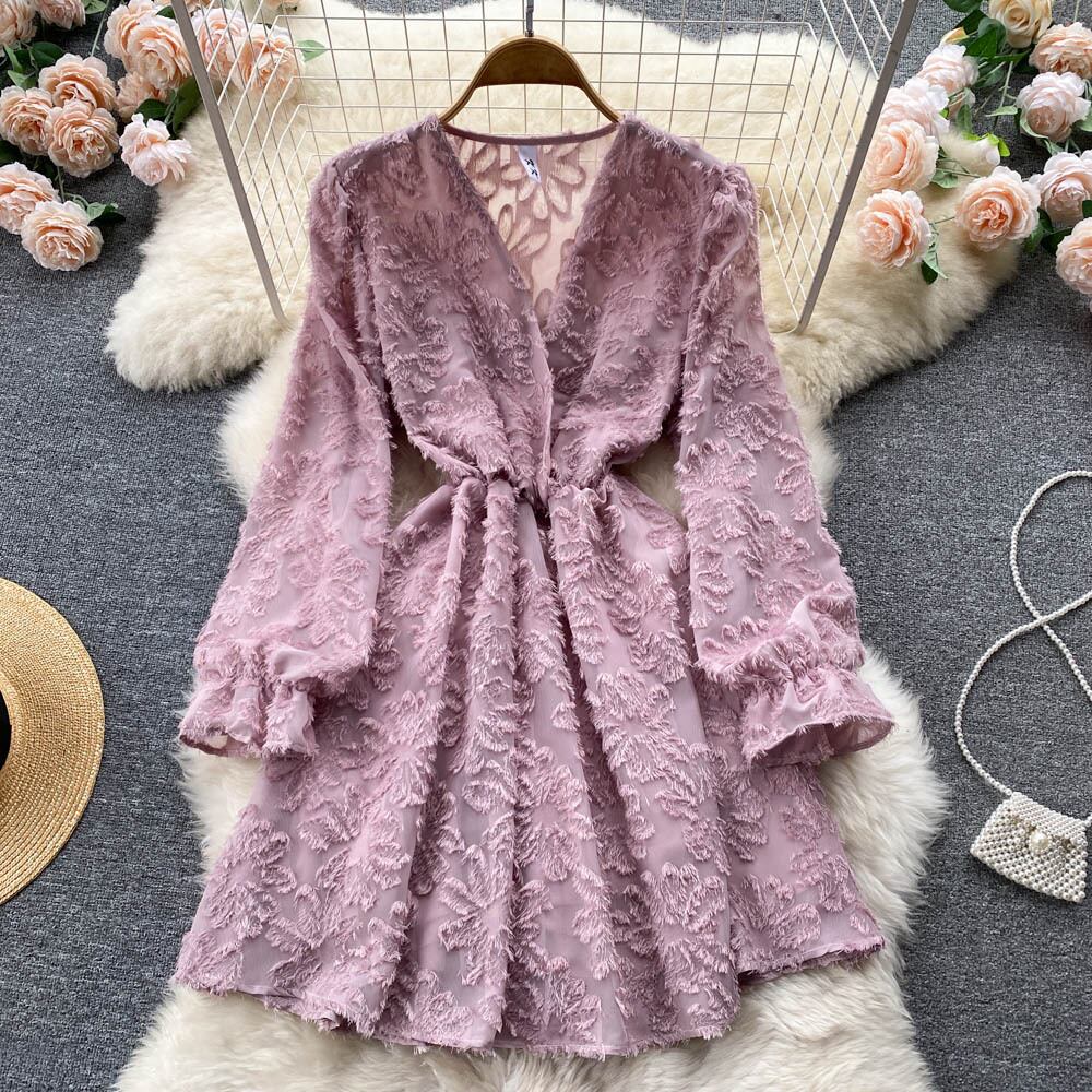 女性フレンチドレス長袖VネックソリッドAラインドレス春のストリートウェアショートドレス2022 ロング スプリング 春物 ソリッドカラー Abe54766732685