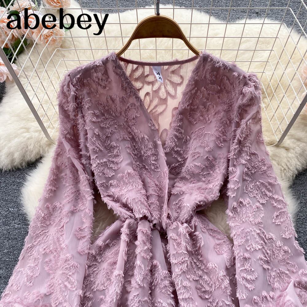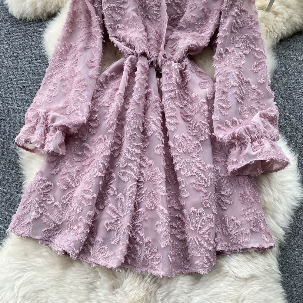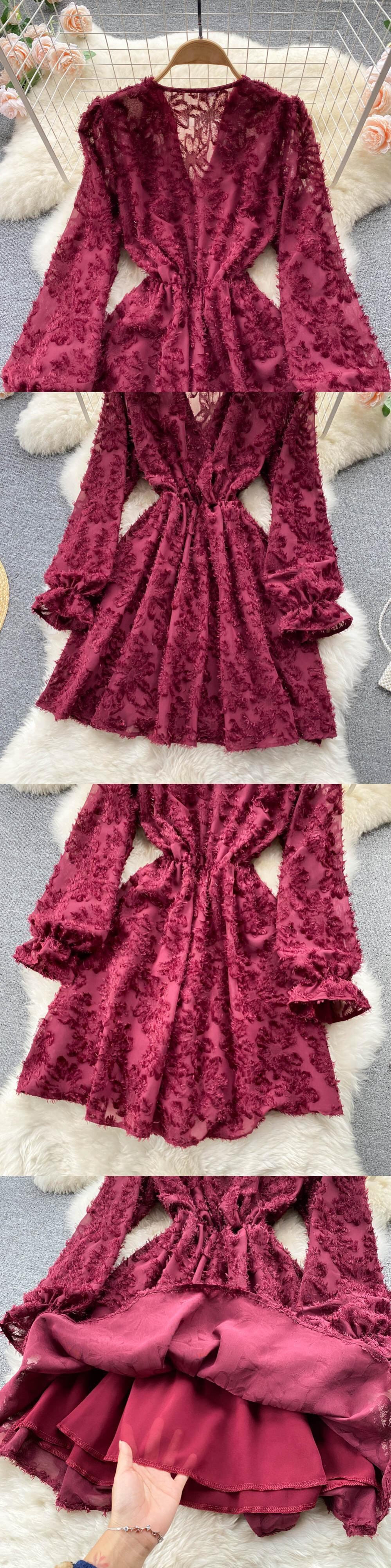 女性フレンチドレス長袖VネックソリッドAラインドレス春のストリートウェアショートドレス2022 ロング スプリング 春物 ソリッドカラー Abe54766732685