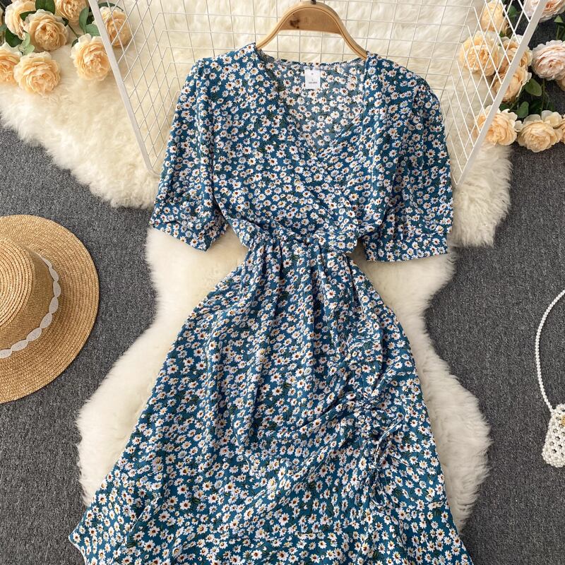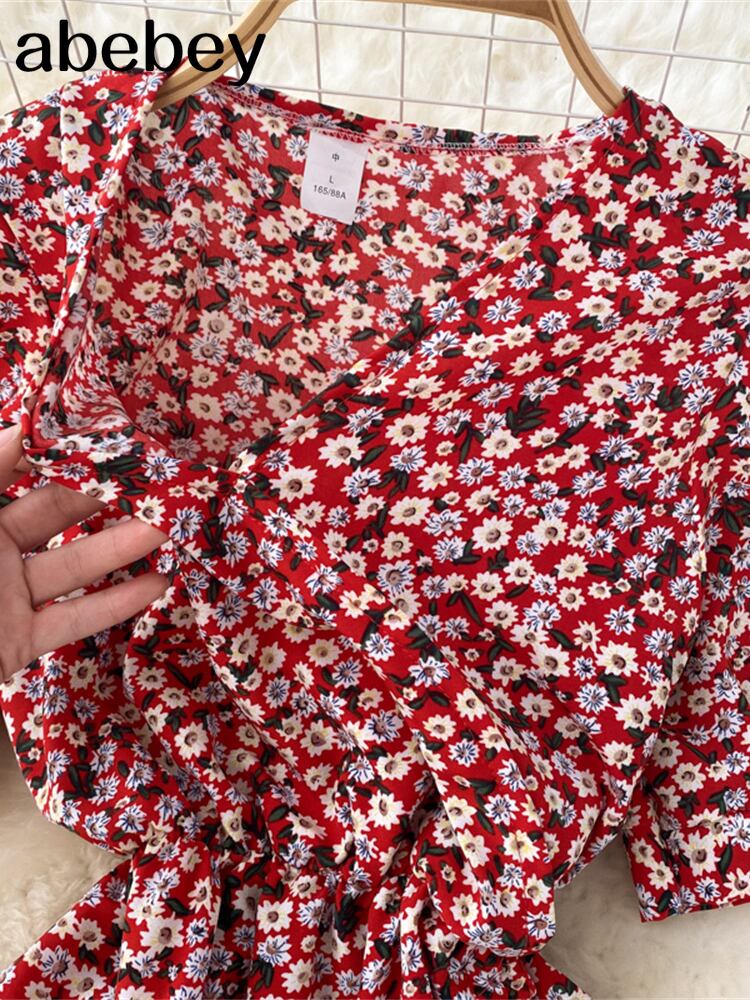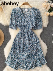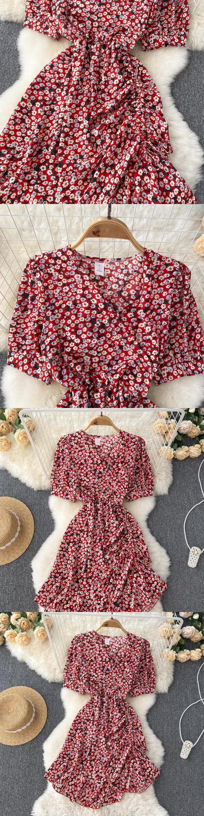 女性フローラルラップドレスVネックタイアップフロントフリルミニドレスサマーオフィスLady2022プリントペンシルドレス 夏物 花柄 会社 学校 通勤や通学にも Abe34791634653