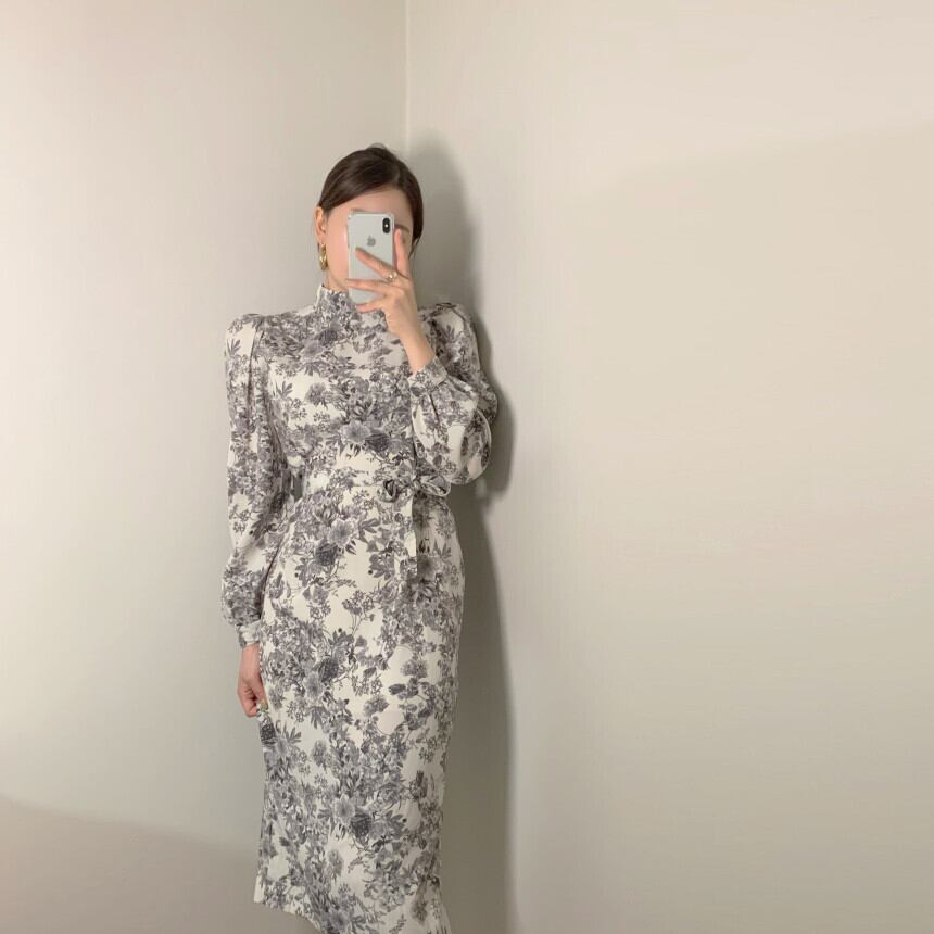 バージョンシックなスタンドカラー小帯スリム壊れた花ロングドレス2021春と秋 スプリング 春物 オータム 秋物 フラワーデザイン Rhc45863666764