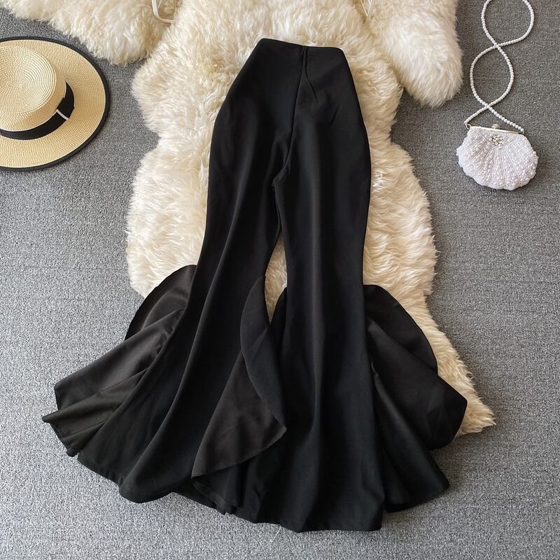 2021フリルフレアパンツ黒人女性ボディコンウエストベルボトムパンツシックな無地パンツストリートウェア ブラック ソリッドカラー Rhc68360078536