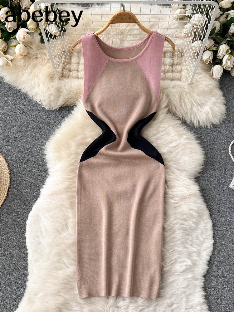 2022年サマーニットセクシーストラップドレス女性パットワークエラティックウエストボディコンサンドレスビーチバックレスミディドレス 夏物 Abe64998577742