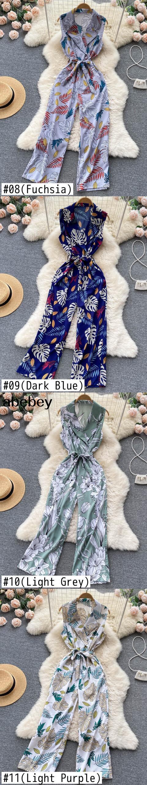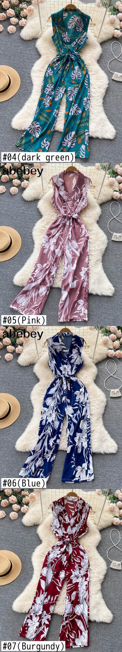 女性ロンパース2022サマールーズタンクジャンプスーツノースリーブリーフフローラルプリントサッシノッチカラーロングレッグプレイスーツオーバーオール 夏物 花柄 Abe17332291908