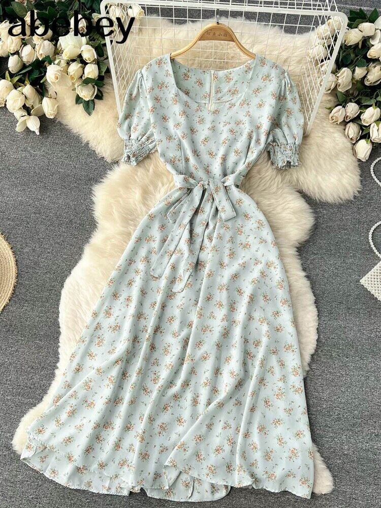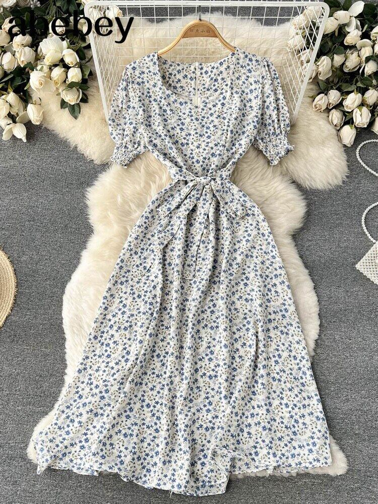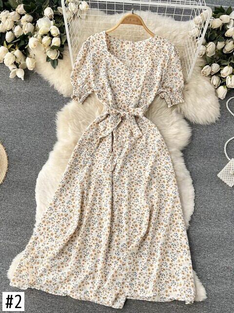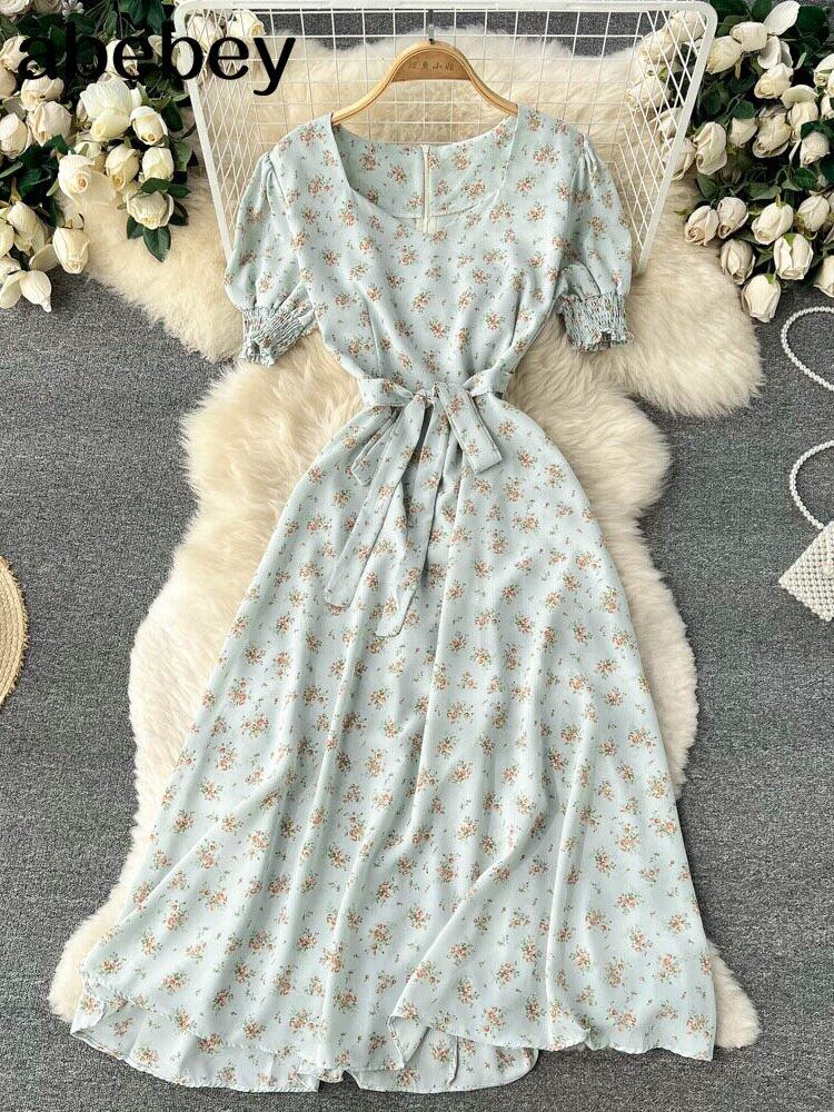 2022女性フローラルシフォンドレス半袖ボウスイートビーチAラインサンドレスプリントロングミディドレス ショート リボン ハーフスリーブ 大人ガーリー スウィート キュート カジュアル 花柄 Abe60959885015