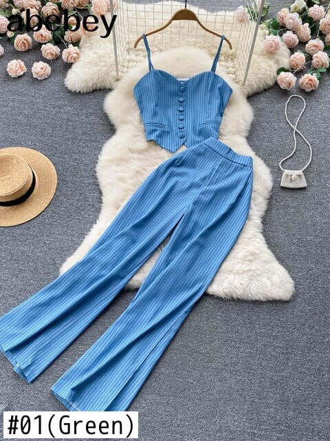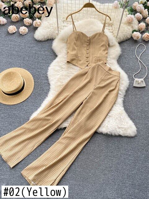 2022年夏の女性のセクシーなストライプ22ピースセットノースリーブタイトショートトップ&ウエストフレアパンツセット レッド サマー 夏物 Abe67991469466