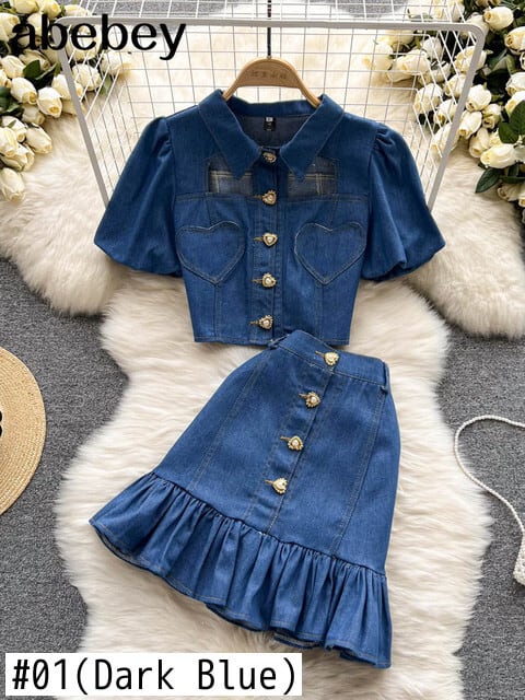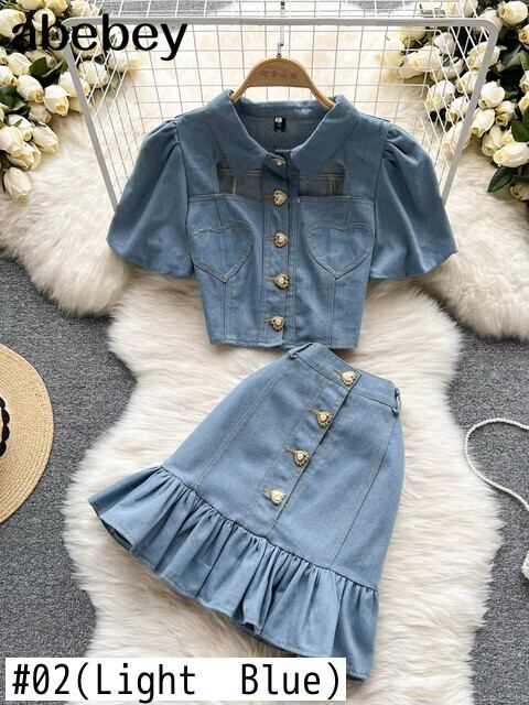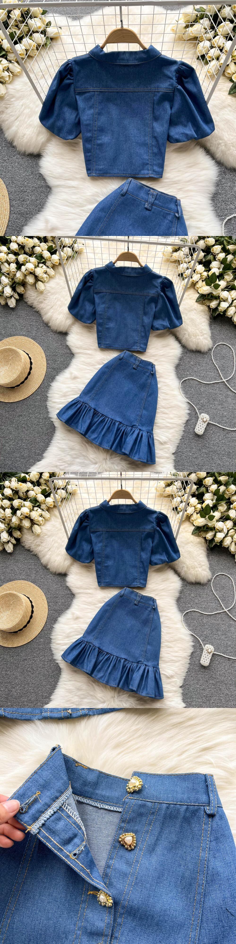 女性の夏のセクシーなデニムセット半袖ボタントップス+ショートボタンミニスカートショートスカートツーピーススーツ ハーフスリーブ サマー 夏物 Abe64125980492