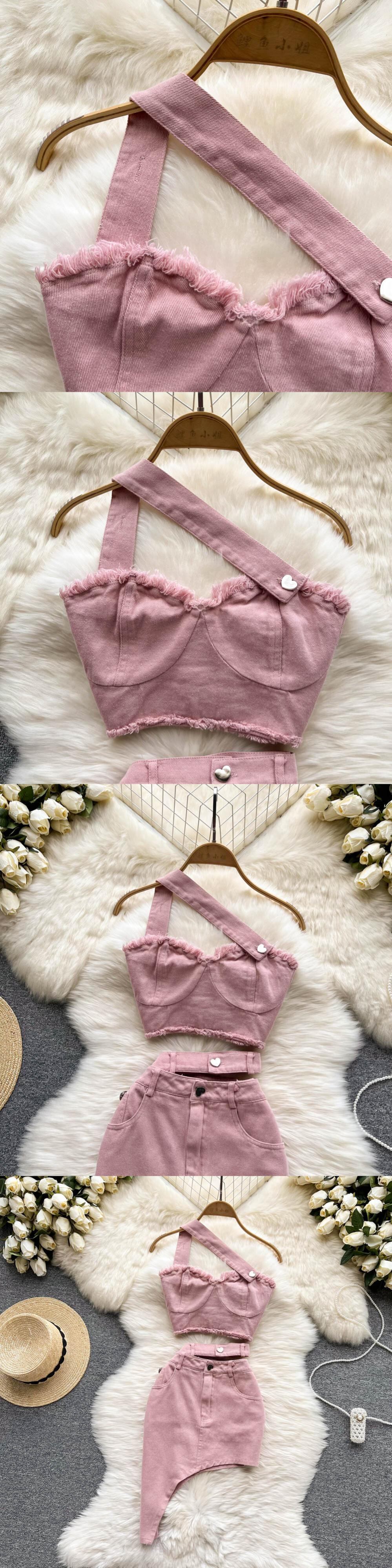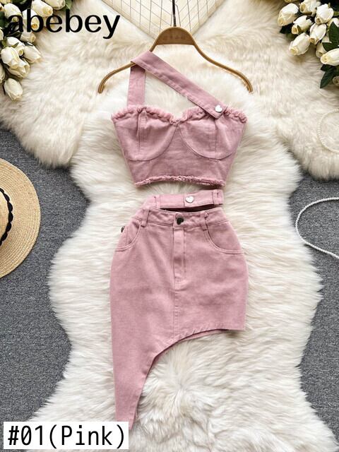 女性夏セクシーデニムセットストラップレススリングトップス+ショートiIrregularミニスカートショートスカートツーピーススーツ サマー 夏物 Abe56244911036