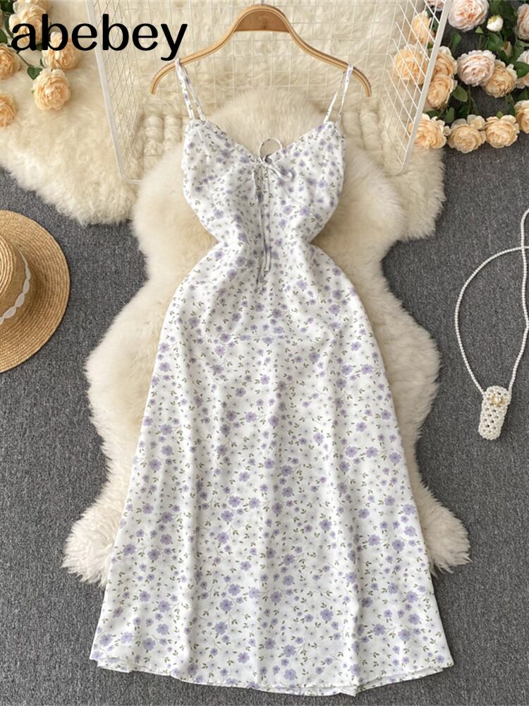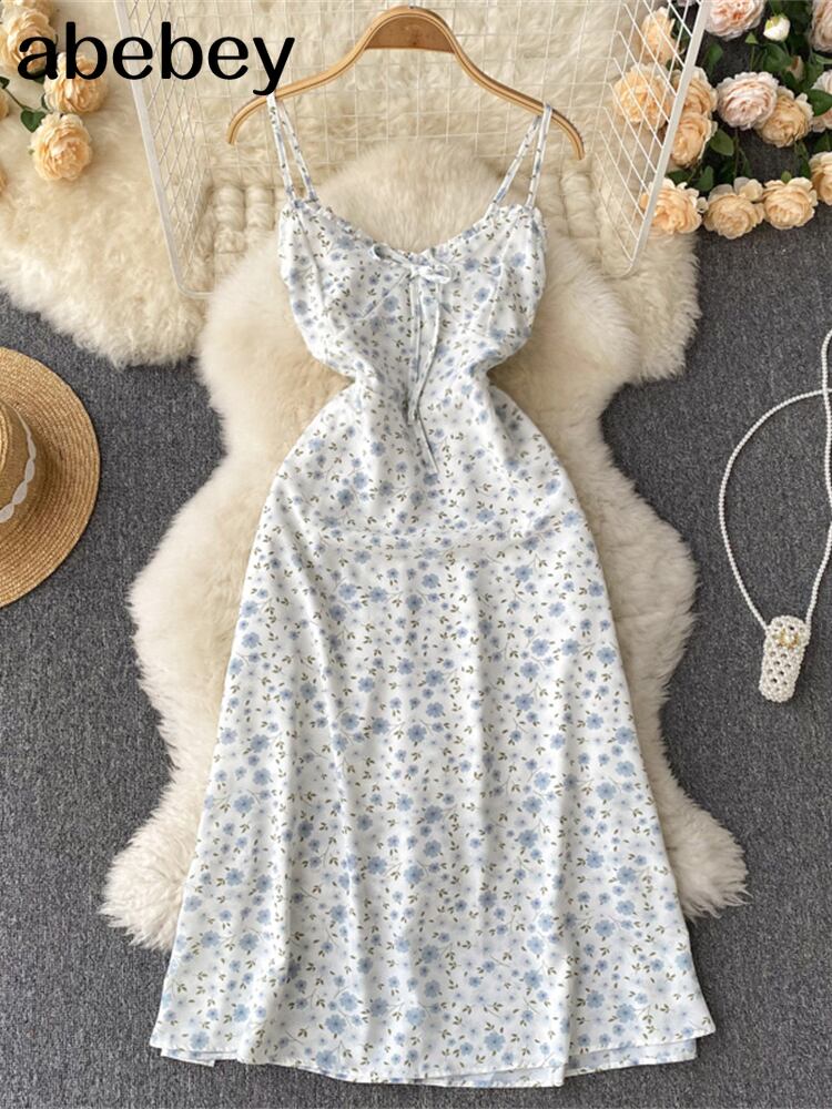 ドレス女性2022ヴィンテージフローラルドレスフリル恋人ネックノースリーブストラップネクタイフリル裾サマービーチドレス 大人ガーリー スウィート キュート カジュアル 夏物 花柄 ビンテージ Abe1493182268
