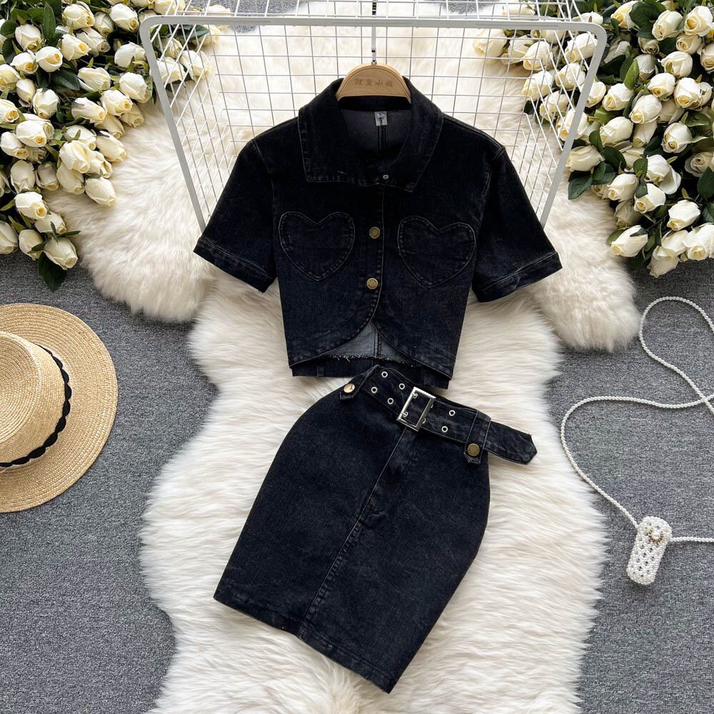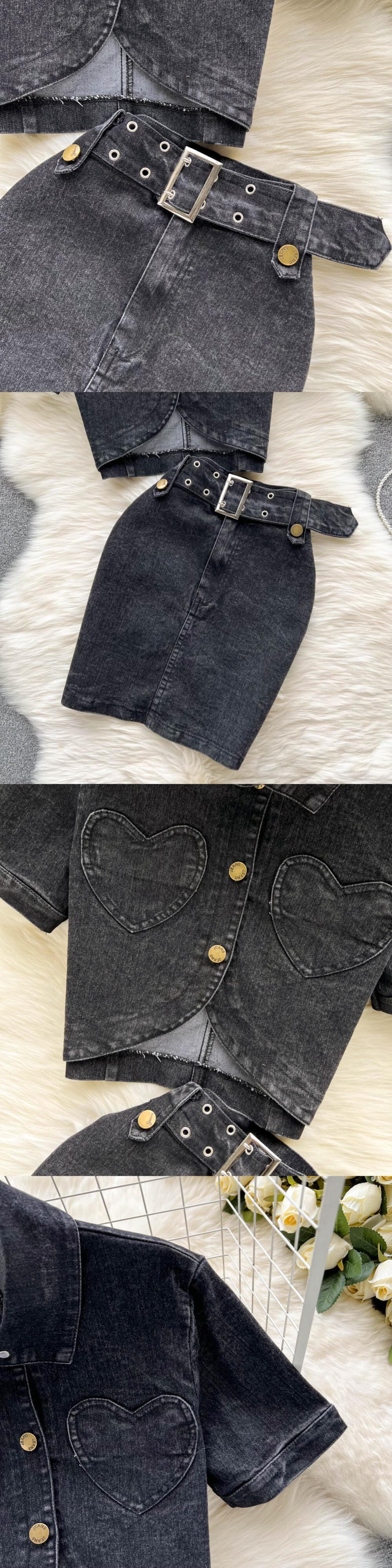 女性2022デニムセットターンダウン-襟シングルブレストショートアウター+セクシーサッシュショートミニスカートツーピーススーツ Abe27413365284