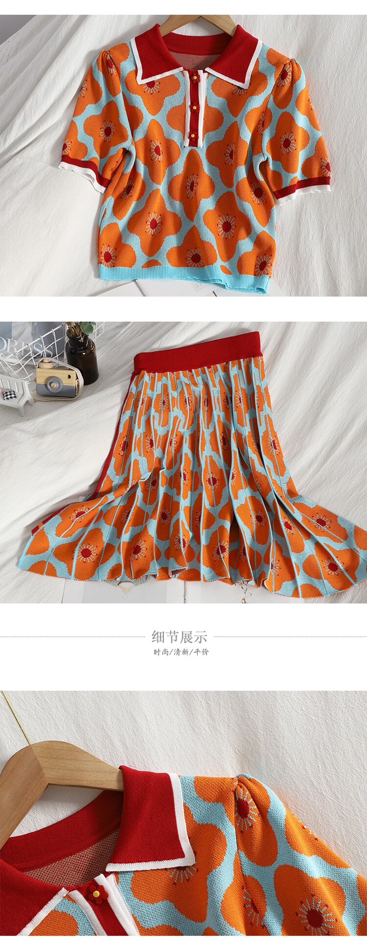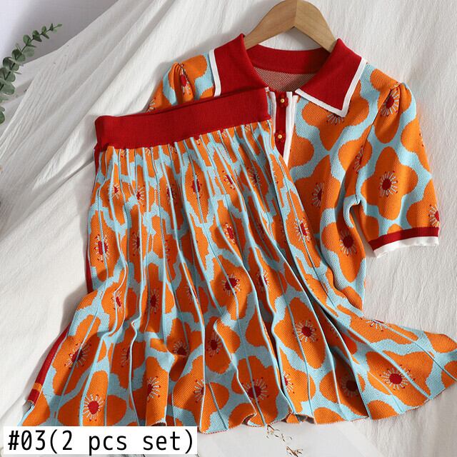 サマーブレストラペルパフスリーブプルオーバートップ+ウエストバッグヒッププリーツスカートニットツーピーススーツレディース 夏物 Rhc85610075350