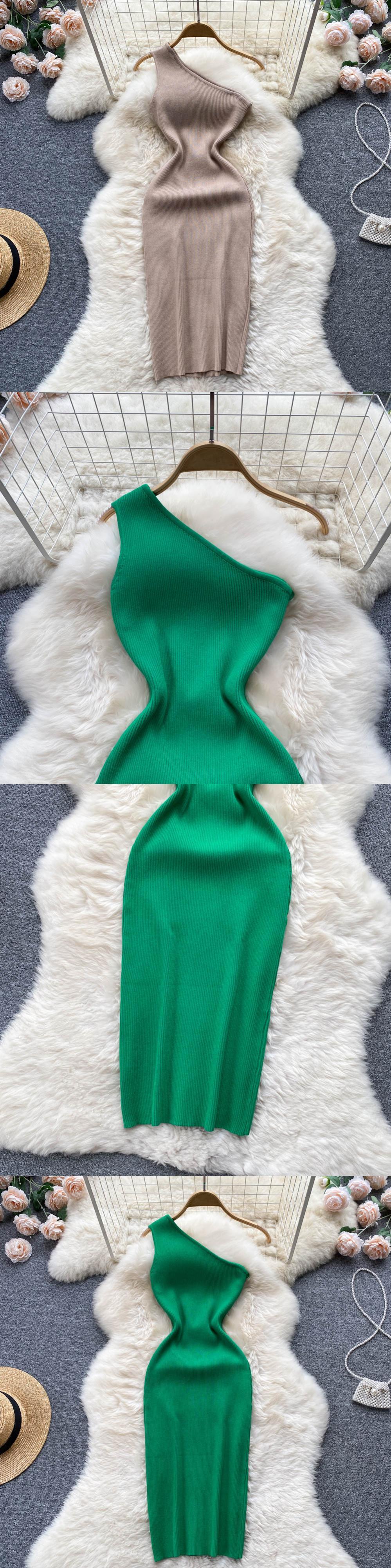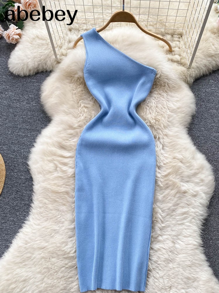 2022セクシーな女性のニット鉛筆ドレスワンショルダーノースリーブ弾性スリムシースドレス夏のシックなストリートウェアミディドレス エラスティック 伸縮 サマー 夏物 Abe68688622171
