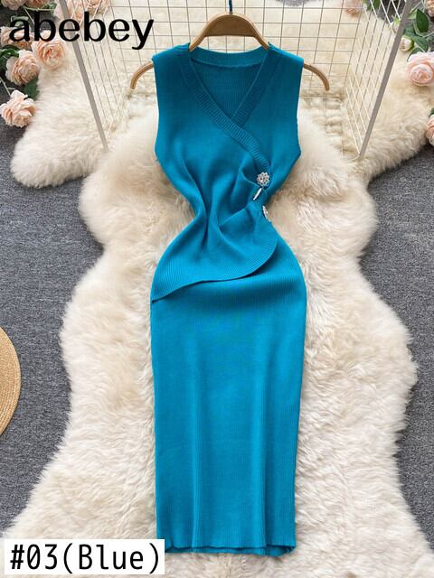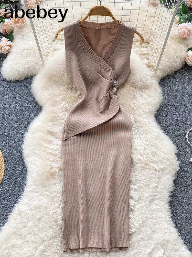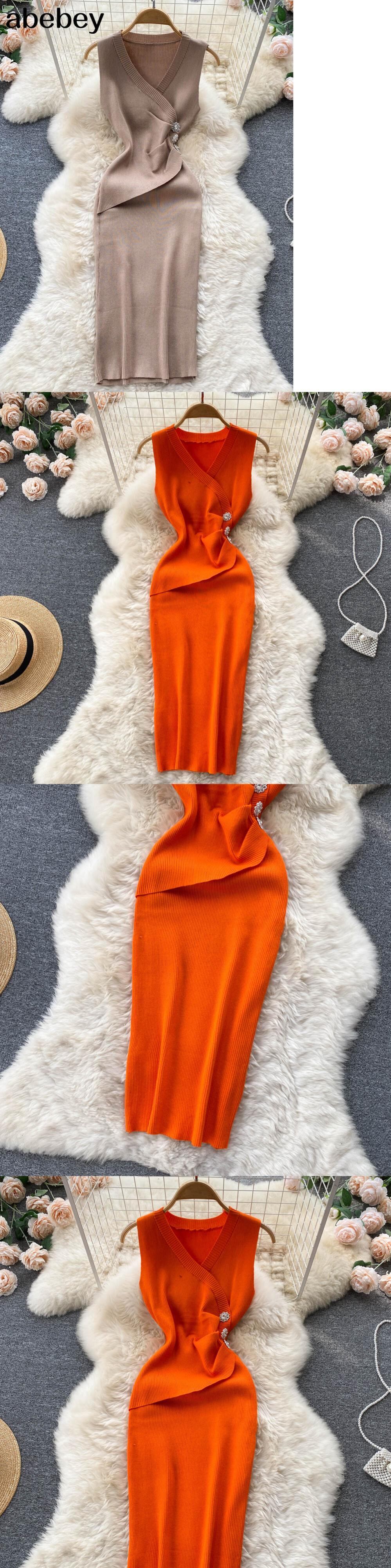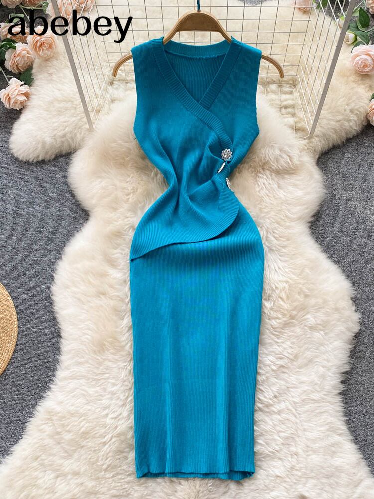 サマーニットセクシーストラップドレス女性Vネックエラティックウエストボディコンサンドレスビーチボットンズノースリーブロングドレス 夏物 Abe26546422788