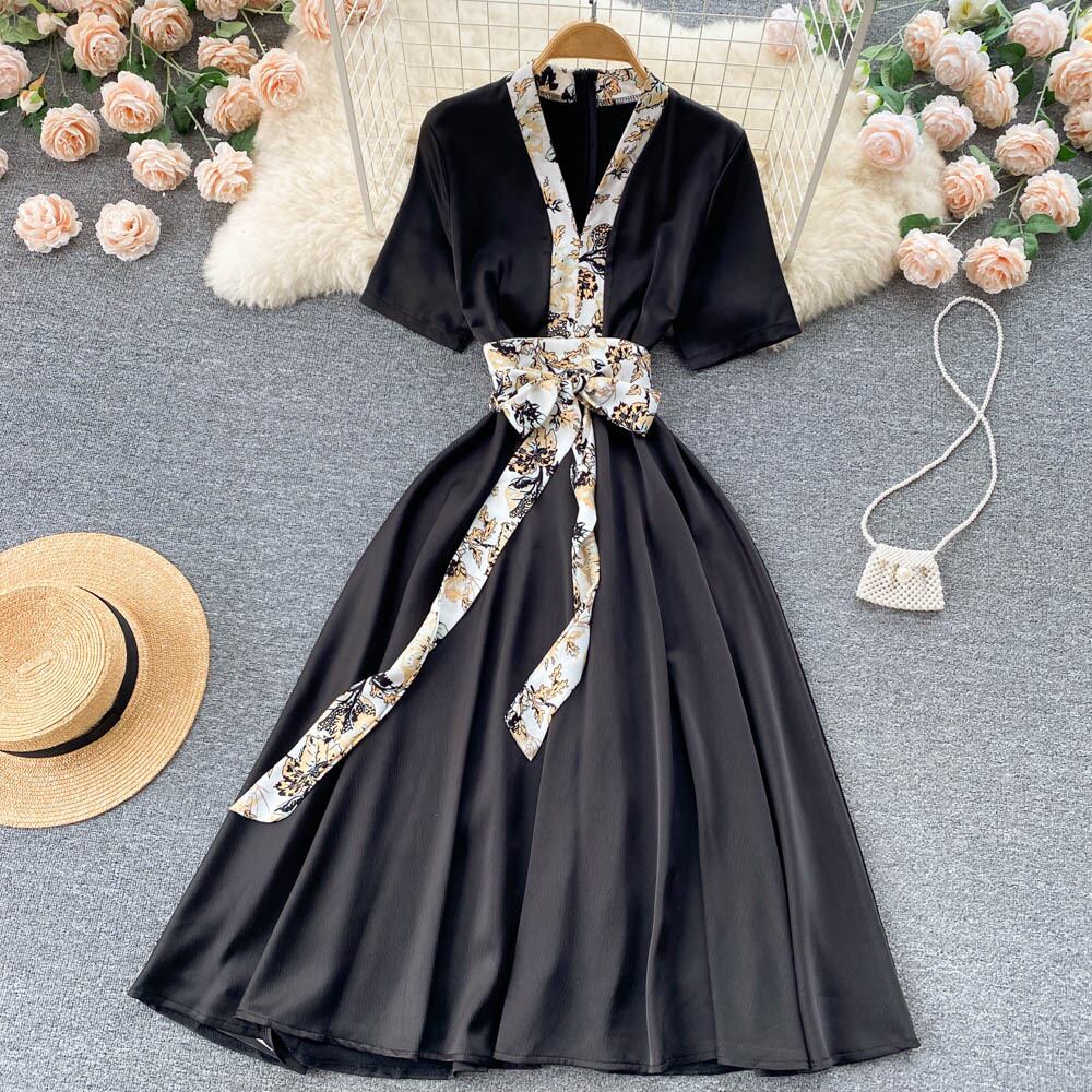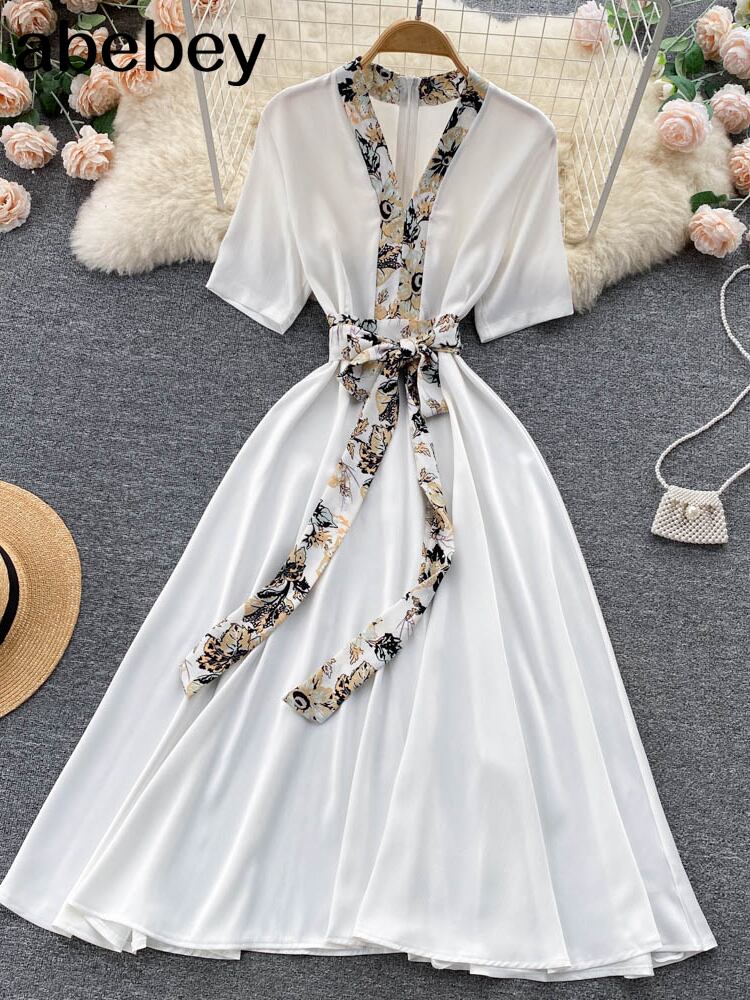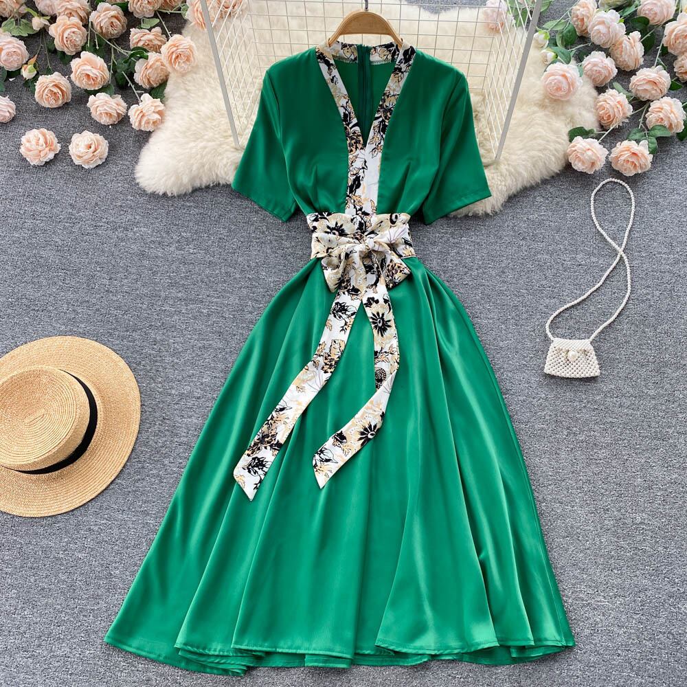 夏のセクシーなVネックサッシドレス女性半袖ウエストAラインバケーションビーチミディローブグリーン/ホワイトVestidos ショート ハーフスリーブ サマー 夏物 Abe53232499206