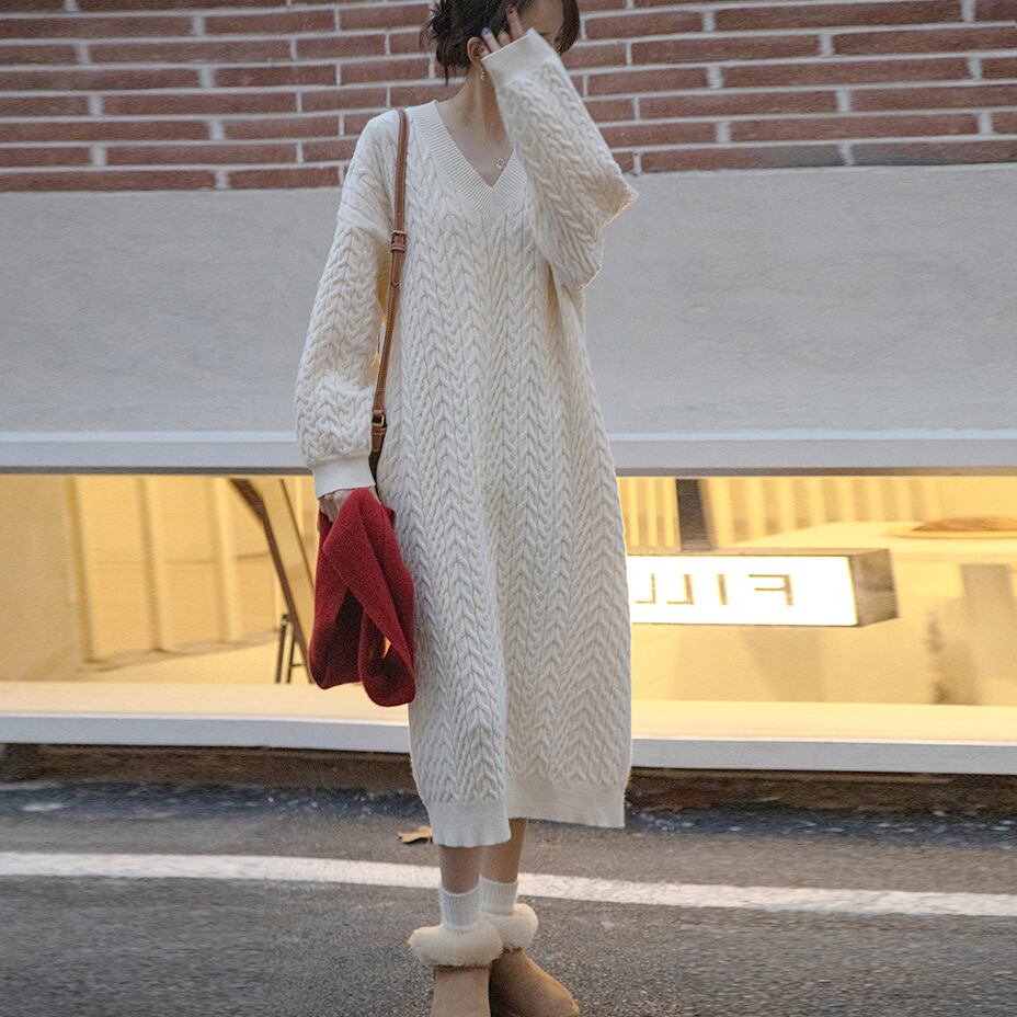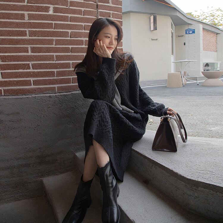 女性のニットドレス2021秋冬シックなレトロツイストセータードレスジェントルスタイルソリッドロングドレス オータム 秋物 ウィンター 冬物 ソリッドカラー Rhc26034420526