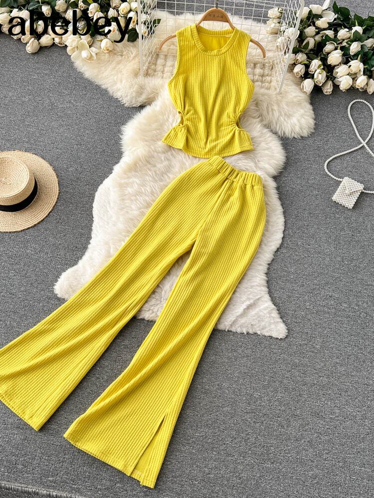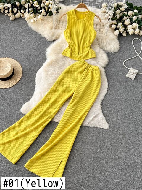 女性パンツセットボディコンスリムホローアウトショートタンクトップ+ストライプワイドレッグロングパンツソリッドサマーツーピーススーツ 夏物 ワイドパンツ ソリッドカラー Abe25243495484