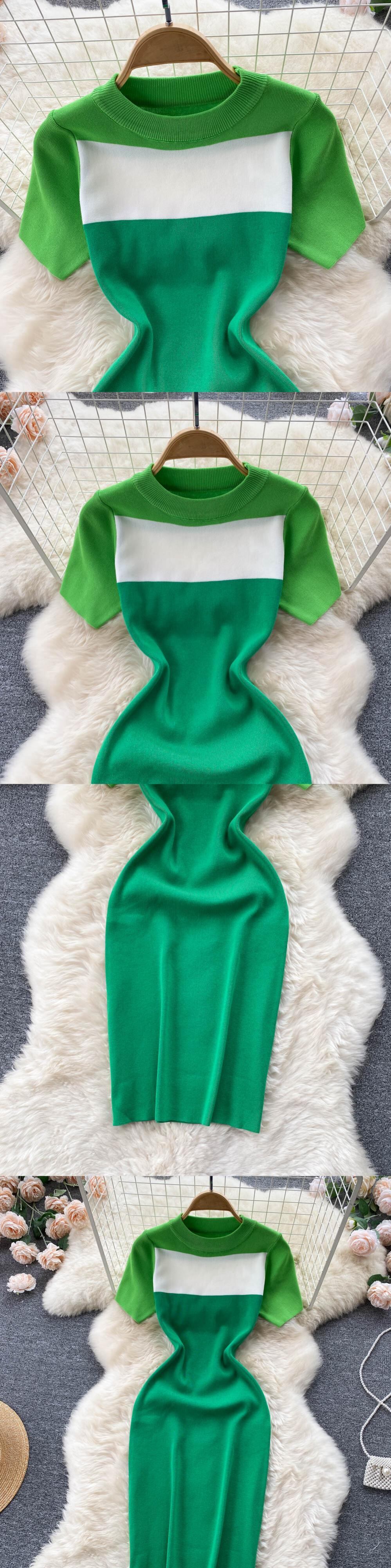 夏のパットワークカラーニット半袖ラウンドネックドレス女性の衣装ストリートウェアクラブウェアアーバンボディコンドレス ショート ハーフスリーブ サマー 夏物 Oネック Abe80052555177