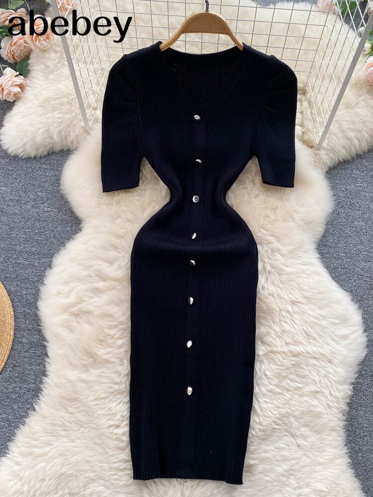 ニット半袖ボディコンミディドレス女性夏セクシーVネック包帯ストリートウェアソリッドストレッチレディドレス ショート ハーフスリーブ サマー 夏物 ソリッドカラー Abe35536941829