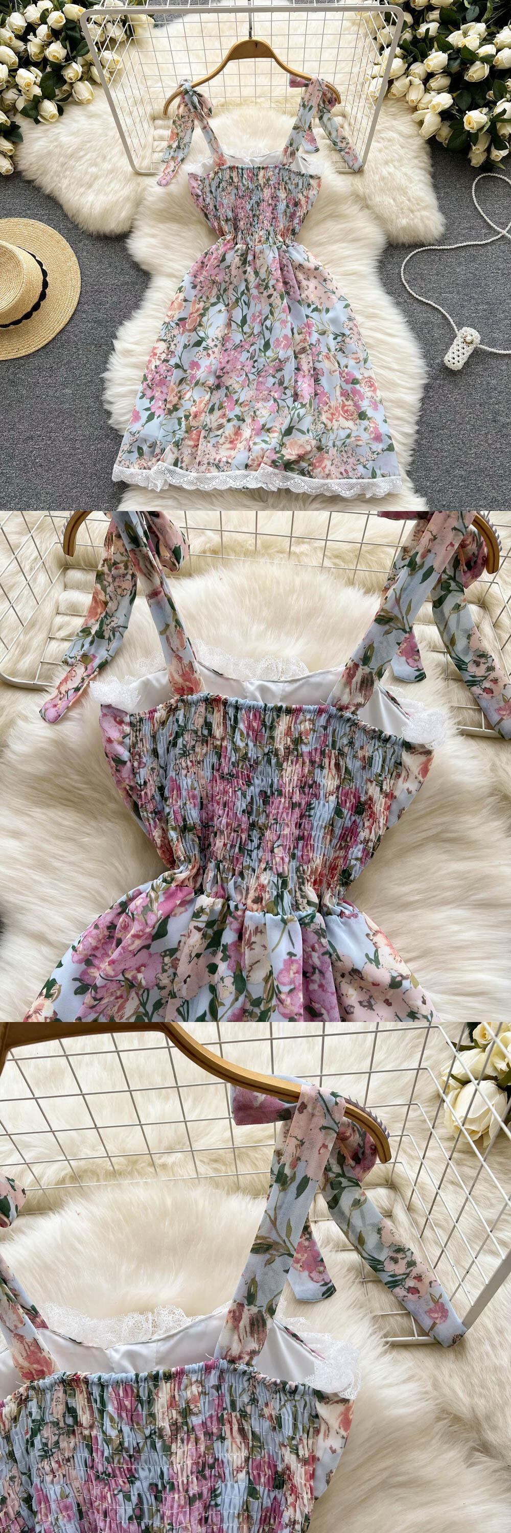 自由奔放に生きるフローラルショートビーチドレスサマーウィメンズスパゲッティストラップフリルミニサンドレスホリデーウエストフレアAライン レッド ラッフル 夏物 花柄 Abe86146450801
