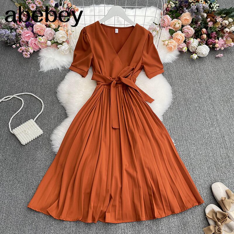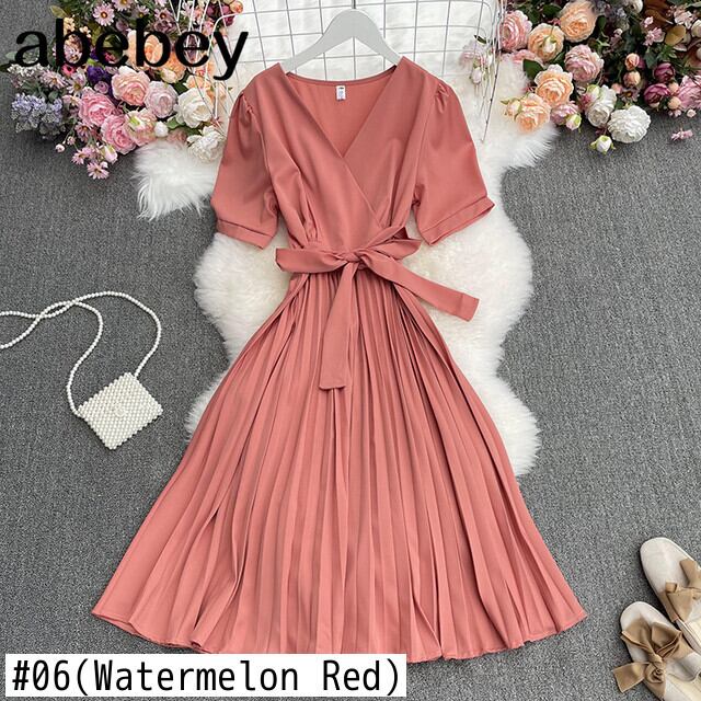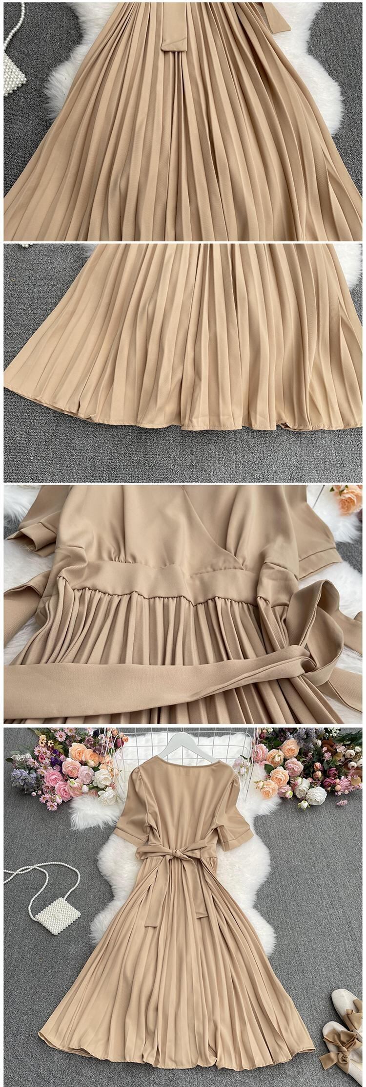 女性プリーツドレスVネック半袖サッシAラインドレススリムソリッドドレス ショート ハーフスリーブ ソリッドカラー Abe22562649960