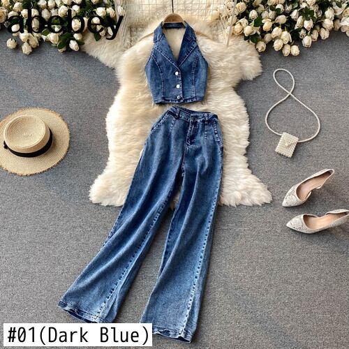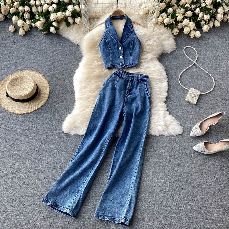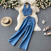 女性サマーレトロデニムセットセクシーノースリーブバックレスストラップショートトップス+ウエストロングパンツツーピーススーツ 夏物 Abe51345337246