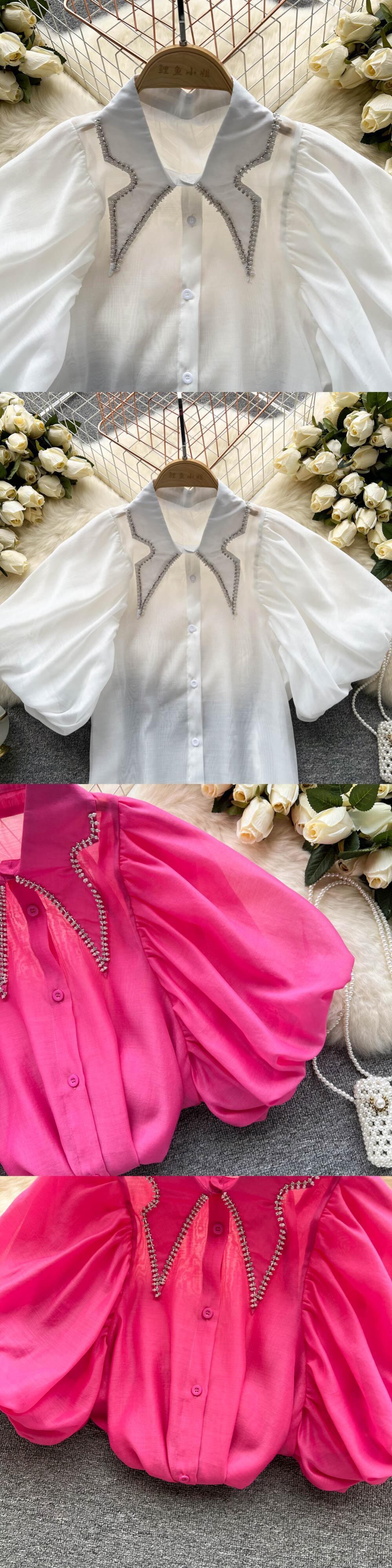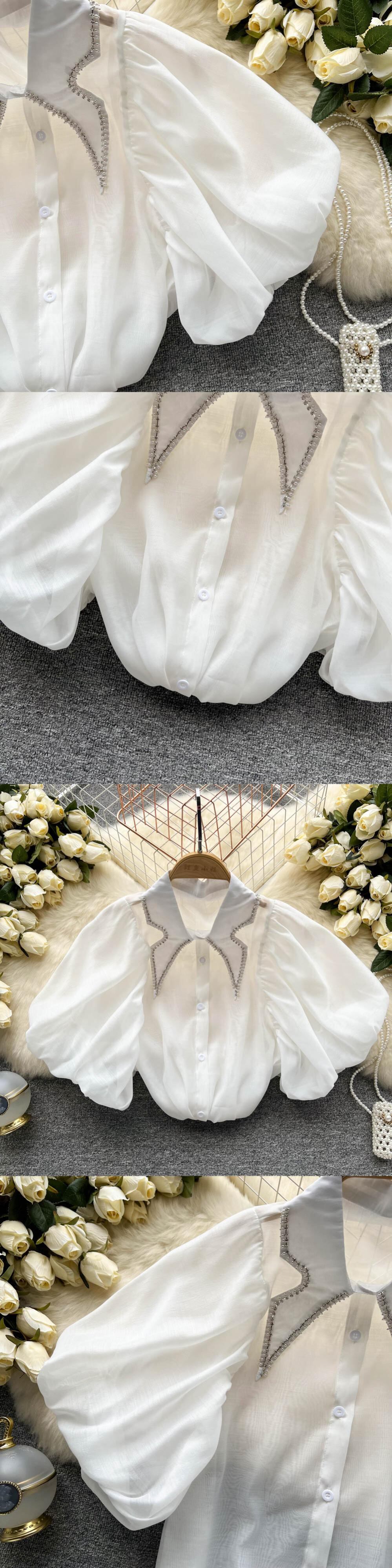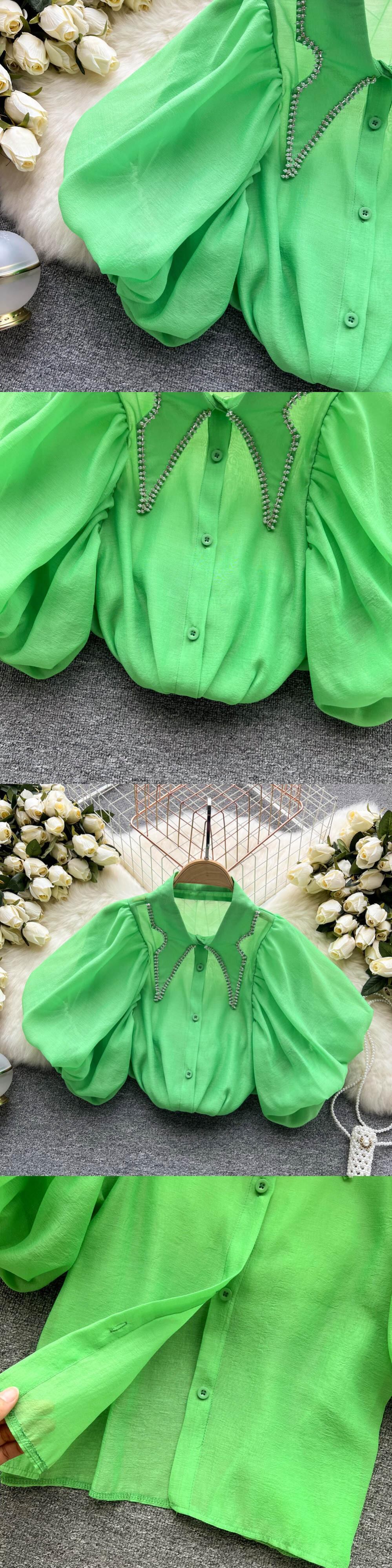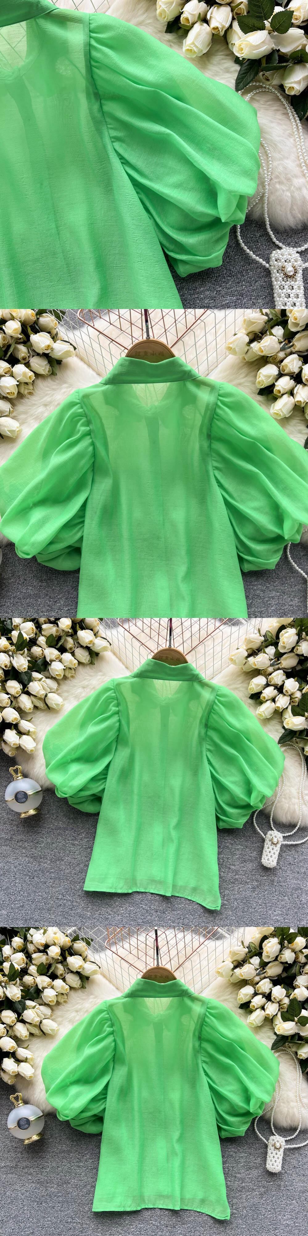 フリルパッチワークスウィートシャツブラウス女性シースルーパフスリーブシングルブレストチェック柄シフォンシフォン ラッフル 大人ガーリー キュート カジュアル Abe84697240960
