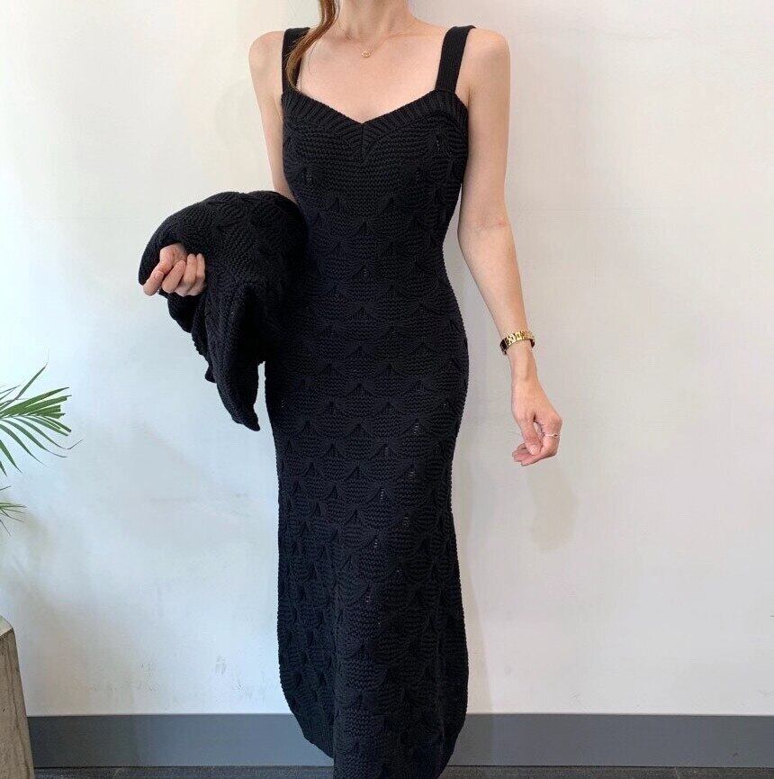 シックニットシングルブレストランタンスリーブカーディガンセーターコートVネックノースリーブスパゲッティストラップセータードレス2点セット Rhc65406965697