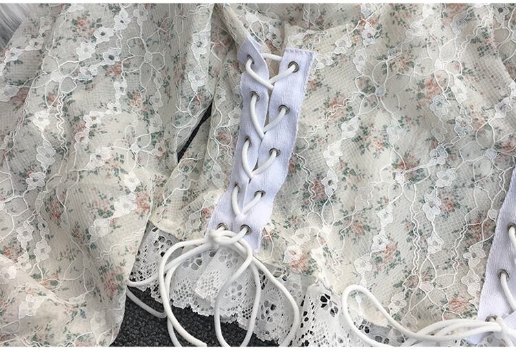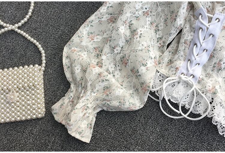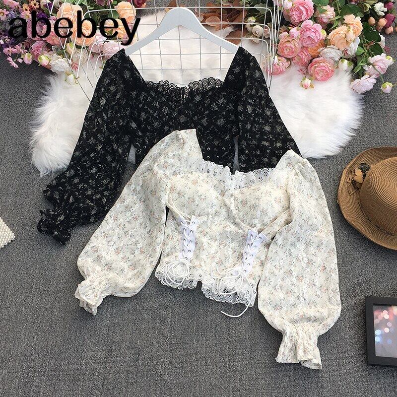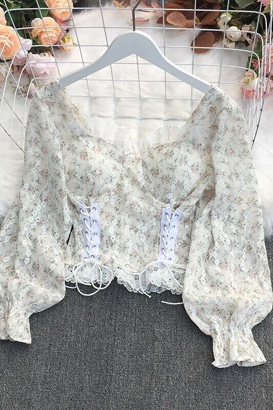 2022年春のスウィートオールマッチスクエアカラーランタンスリーブレースレース包帯ウエストスリムショートシャツトップ 大人ガーリー キュート カジュアル スプリング 春物 スクウェア Abe97074587226