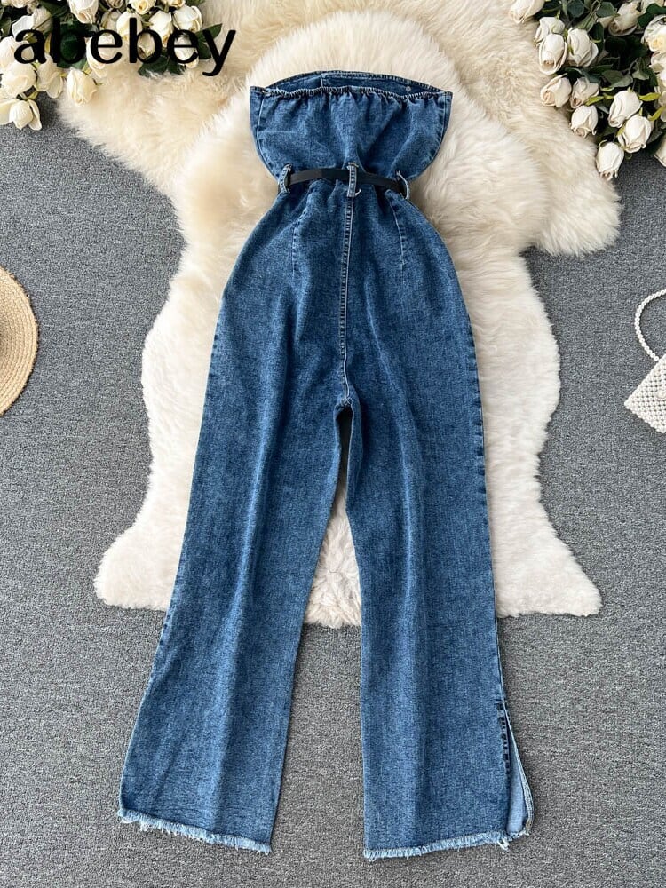 2022年夏のヴィンテージデニムプレイスーツレディースノースリーブストラップレスボディコンロングロンパースジャンプスーツジーンズオーバーオールレディース サマー 夏物 ビンテージ Abe74771871220