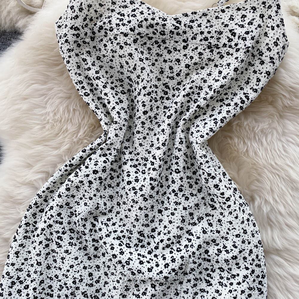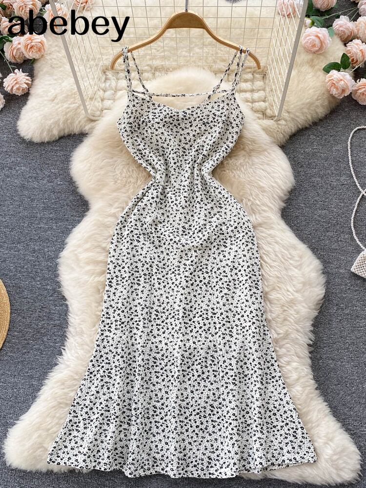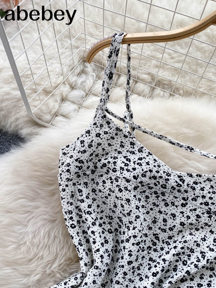 花柄ショートサマードレス女性2022スパゲッティストラップミディドレス自由奔放に生きるサンドレス包帯背中の開いたセクシーなドレスホワイト 夏物 Abe56356012901