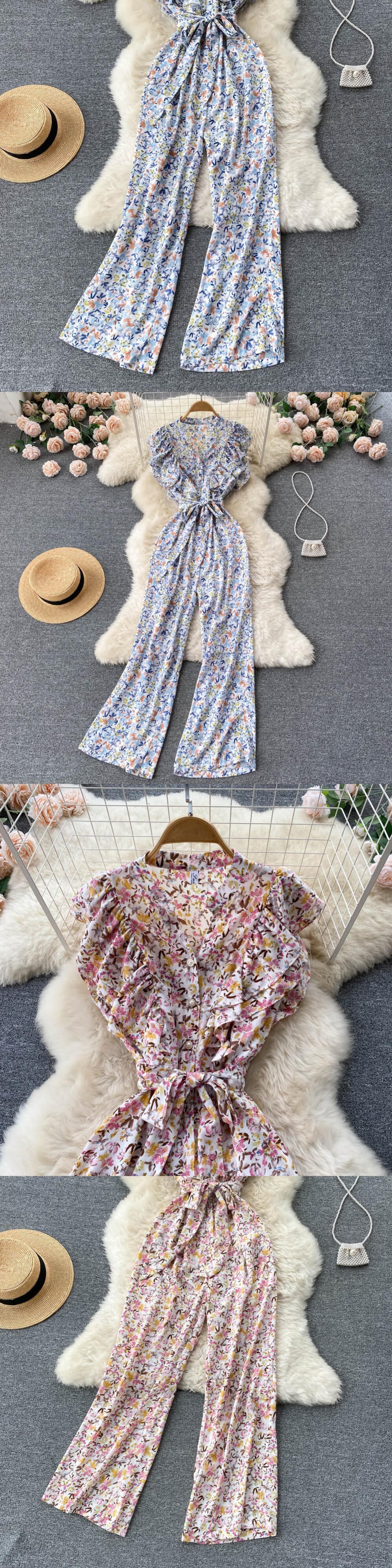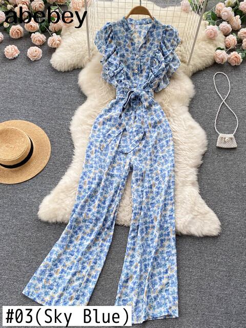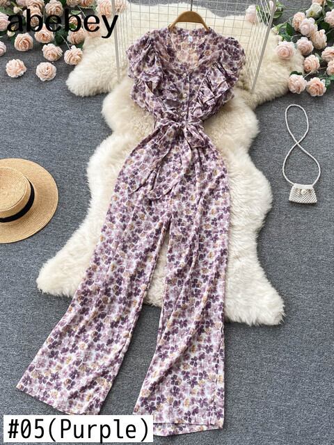 女性ロンパース2022サマールーズタンクジャンプスーツノースリーブフリルフローラルプリントサッシVネックロングレッグプレイスーツオーバーオール 夏物 花柄 Abe30226791890